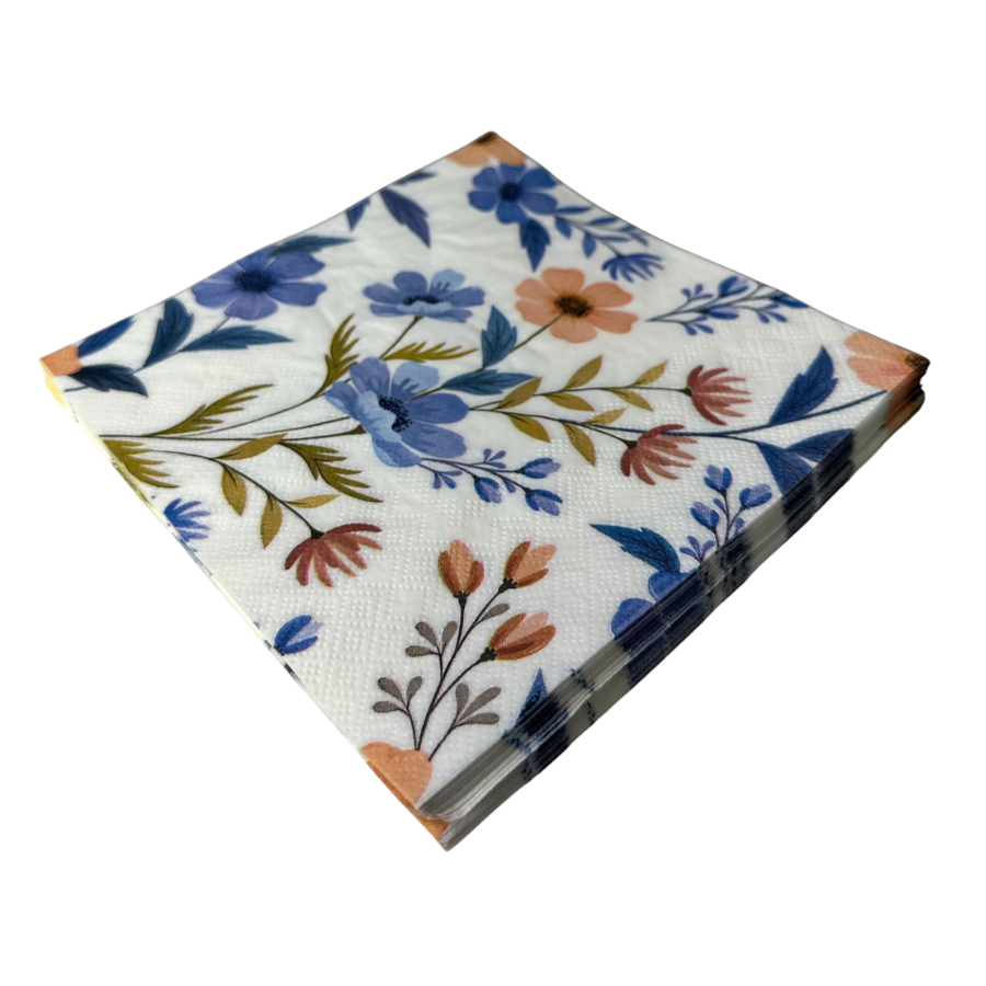 Guardanapo Decorativo Floral Azul e Terracota – Pacote com 20 Unidades Guardanapo de papel com estampa delicada de flores em tons de azul, terracota e folhagens em verde, ideal para compor mesas elegantes e modernas. Perfeito para almoços, jantares, confraternizações e eventos especiais. Além de valorizar a decoração da mesa, também pode ser utilizado em artesanato e técnica de decoupage, proporcionando um acabamento criativo e sofisticado em caixas, MDF, vidros e peças decorativas. Produto de qualidade, com ótima absorção e excelente definição de estampa. Importante: Por se tratar de um produto com estampa, podem ocorrer pequenos erros, variações de cor ou alinhamento, características normais do processo de fabricação.
