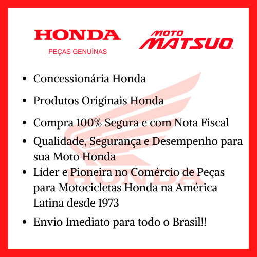 Guarnição Tampa Válvula com 3 Coxins Original Honda Código Honda: 12391-KPF-900 / 90543-MV9-670 Aplicação: CBX 250 Twister - Modelos de 2001 a 2008 XR250 Tornado - Modelos de 2001 a 2008 Descrição do Produto A guarnição da tampa de válvula, junto com os coxins, é fundamental para manter a vedação da Tampa do Cabeçote, garantindo sua performance e durabilidade. Peça original Honda, fabricada com precisão para evitar vazamentos e maximizar o funcionamento adequado do motor. Informações Importantes Produto novo e original Honda, com qualidade garantida. Garantia de 3 meses contra defeitos de fabricação. Todas as vendas acompanham nota fiscal. Recomendamos a instalação por um profissional qualificado. Devolução aceita apenas na embalagem original e sem sinais de uso. Dica: Aproveite o frete para adicionar outras peças Honda ao seu pedido! Atendimento Estamos disponíveis de segunda a sexta-feira, das 8:00 às 18:00 horas, para esclarecer dúvidas e garantir uma experiência de compra satisfatória. Aguardamos sua compra! Atenciosamente, Moto Matsuo Concessionária Honda