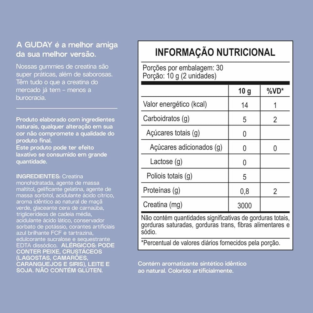 A creatina é o suplemento mais estudado e recomendado pelos cientistas Desempenho físico Durante o exercício, a quantidade de creatina armazenada nos músculos pode ser um fator determinante para o desempenho físico. Indicada para qualquer pessoa A creatina é indicada para qualquer pessoa que queira melhorar sua performance física e sua recuperação. Prevenção de doenças Pode ter efeitos positivos na prevenção de doenças neuromusculares e na saúde cognitiva. Aumento de força Pesquisas indicam que a creatina pode aumentar a força entre 10/15% em menos de 4 semanas. O fim da creatina em pó APENAS INGREDIENTES ESSENCIAIS - APENAS INGREDIENTES ESSENCIAIS Nossa formulação contém apenas o essencial, evitando aditivos desnecessários. FÁCIL DE LEVAR PARA VIAGENS - FÁCIL DE LEVAR PARA VIAGENS Companheiro perfeito para suas viagens, seja para negócios ou lazer. - SEM GOSTO RESIDUAL DA CREATINA - SEM GOSTO RESIDUAL DA CREATINA Diga adeus ao gosto persistente e desagradável comum em muitos suplementos. GUMMIES GOSTOSAS - GUMMIES GOSTOSAS Uma combinação de saúde e sabor em cada mordida, tornando sua experiência diária muito mais agradável.