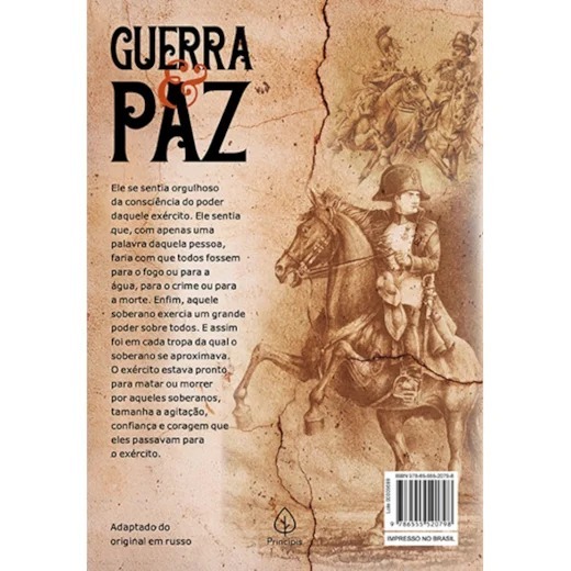 Guerra e paz é a obra-prima de Liev Tolstói e retrata a sociedade russa antes e durante a invasão de Napoleão Bonaparte e seu exército à Rússia. Os reflexos da guerra são aprofundados em duas famílias aristocratas: Rostov e Bolkónski. O medo e a miséria do povo se contrastam com bailes realizados pela nobreza. Em um cenário bélico, religioso e incerto, o enredo disseca as jogadas de poder e seus impactos na sociedade, enquanto deixa transparecer as fraquezas da humanidade. 16x23cm 368 Páginas