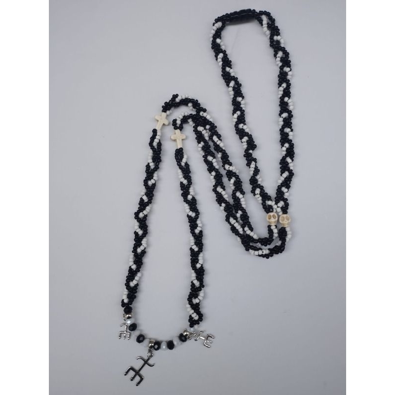 Modelo: Exú. Material: miçanga vidro preta e branca, caveiras e cruz de pedras,detalhes em cristais 8mm, firma de murano e 3-pingente de metal.