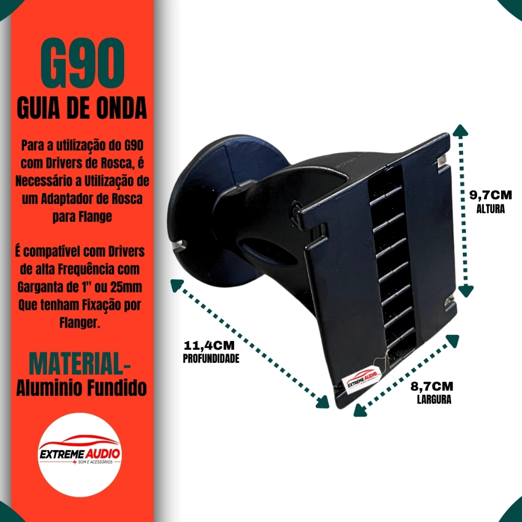 Guia de Ondas Preto EAP G90 / Guia de Ondas BRANCO EAP G90B O G90 e um guia de ondas com entrada de garganta de 25mm. Seu design acustico minimiza reflexos internos e perdas acusticas, enquanto o formato da garganta foi otimizado para reduzir a distorcao do ar. O G90 tem tamanho compacto para alta capacidade de arranjo, e foi otimizado para obter um angulo de dispersao vertical de 65 graus, enquanto o angulo de cobertura horizontal de 120 graus. O G90 foi desenvolvido para obter um otimo desempenho quando acoplado a drivers EAP e e compativel com drivers de alta frequencia com garganta de 1" ou 25mm que tenham fixacao por flange. Atencao: Para a utilizalcao do G90 com drivers de rosca, e necessario a utilizacao de um adaptador de rosca para flange. Especificacoes Tecnicas Range de frequencia:1,1khz a 20Khz Corte de Frequencia Recomeendado: 1.5 khz Cobertura Nominal Horizontal -3db : 120 graus Cobertura Nominal Vertical -3db : 65 graus Dimensoes Comprimento: 114,34mm Largura: 90mm Altura: 97,2mm Peso Bruto: 0,56 kg Peso Liquido: 0,49 kg Material : Aluminio Injetado
