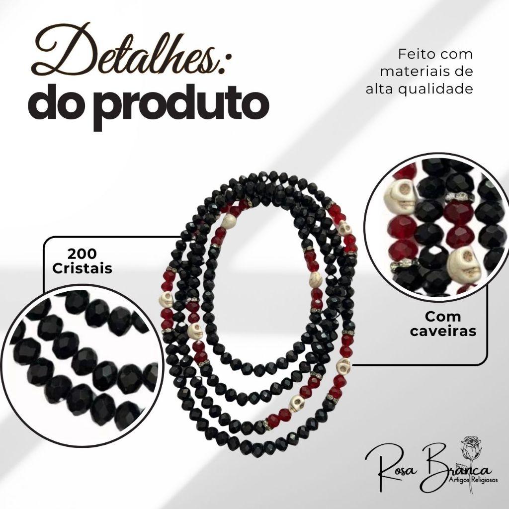 Seja Bem Vindo a nossa loja Rosa Branca! Esse fio de conta contém 200 cristais de exelente qualidade, confeccionado em Cordone com Firma, strass e 7 caveiras INFORMAÇOES DO PRODUTO Cristais: 200 Unidades Firma: 1 Unidade Caveira: 7 Unidades Strass Fio Cordone Tamanho da Guia: 65cm fechada e 130 cm aberta Aproveite para olhar nossos itens no catálogo e qualquer dúvida é só nos chamar nas mensagens que teremos o prazer em te atender! Lembrando que nossos Produtos são produzidos com muito carinho e Axé