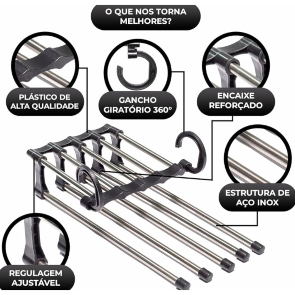 Descrição do produto Economize espaço no seu guarda-roupa, colocando 5 peças de roupas no espaço de apenas 1. O cabide é produzido em aço inoxidável e plástico extremamente durável. Permite duas funcionalidades, tanto horizontal quanto vertical facilitando a organização e salvando espaço. CARACTERÍSTICAS - Modelo: Cabide Para Calças Multifuncional; - Material: Plástico e Inox; - Cor: Branco ou Preto - Cores aleatórias, de acordo a disponibilidade do estoque*** DIMENSÕES - Altura: 7cm; - Largura: 15cm; - Profundidade: 30Cm. BENEFÍCIOS - Permite duas funcionalidades tanto horizontal, quanto vertical facilitando a organização e salvando espaço; - Usando os dois ganchos, ele fica na horizontal, facilitando o manuseio para colocar e tirar suas calças; - Usando um gancho, ele fica na vertical e você economiza espaço de forma rápida e eficiente.