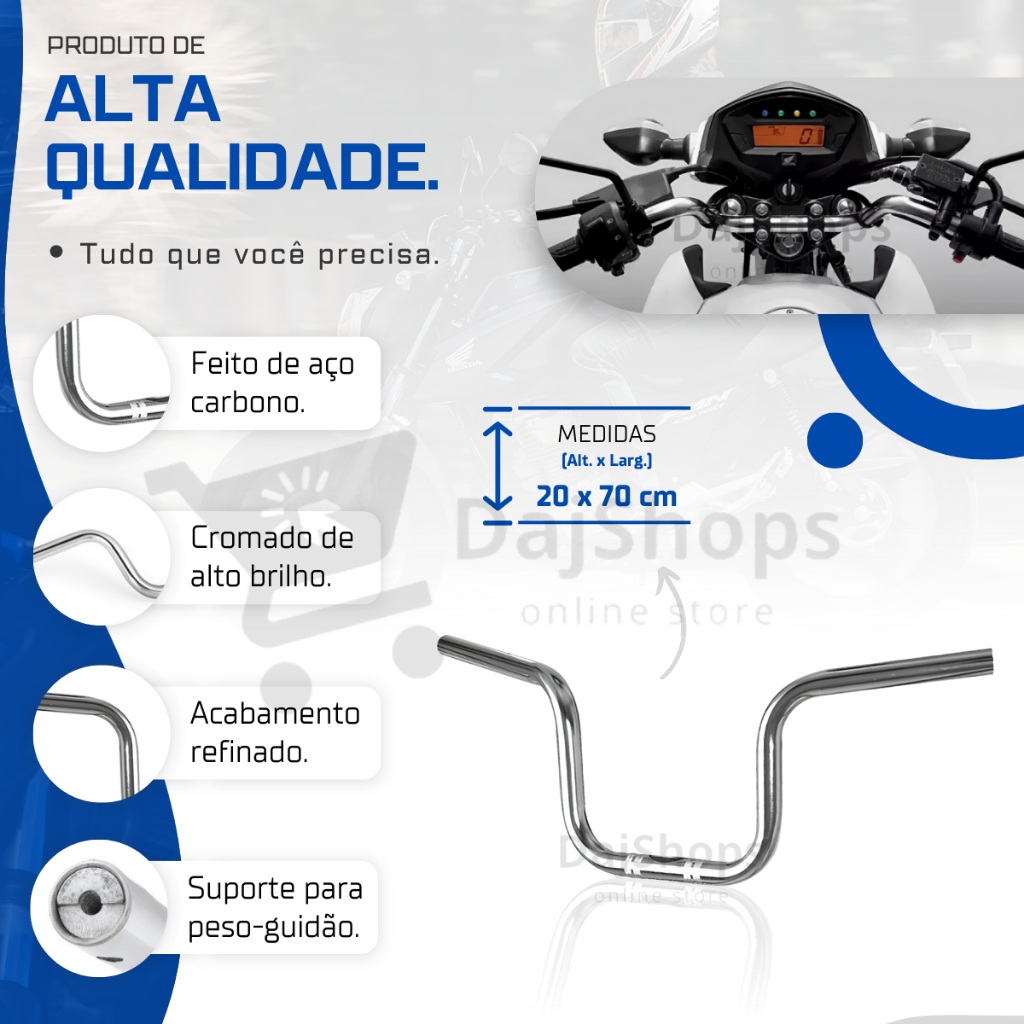 Guidão Cg Cargo Fan Titan 160 2023 Com Peso Cromado Honda 150 *** ENVIO IMEDIATO!!!*** ***COM NOTA FISCAL*** ***** ATENÇÃO ***** ***** Não acompanha os pesinhos PCX e nem as manoplas! ***** Apresentamos nosso incrível guidão cargo 160, cuidadosamente projetado para proporcionar uma experiência de condução excepcional. O guidão, fabricado em resistente aço de alta qualidade, garante durabilidade e resistência, proporcionando estabilidade durante suas aventuras. Com um generoso diâmetro de 73 centímetros, oferece uma pegada confortável e segura, ideal para diversas modalidades de uso. Seja você um entusiasta do ciclismo urbano ou um aventureiro off-road, nosso guidão titan 150 é a escolha perfeita para elevar o desempenho e o conforto da sua bicicleta. Invista na qualidade, na durabilidade e na elegância do nosso produto, e desfrute de cada trajeto com confiança e estilo. ----------------------------------------------------------------------------------------------------------- Compatível com: HONDA CG TITAN 160 HONDA CG FAN 160 HONDA CG START 160 HONDA CG CARGO 160 TODAS DE 2016 A 2023 ----------------------------------------------------------------------------------------------------------- Conteúdo da embalagem: 1x Guidão com suporte para pesinho PCX ----------------------------------------------------------------------------------------------------------- Peso interno Cor Cromado