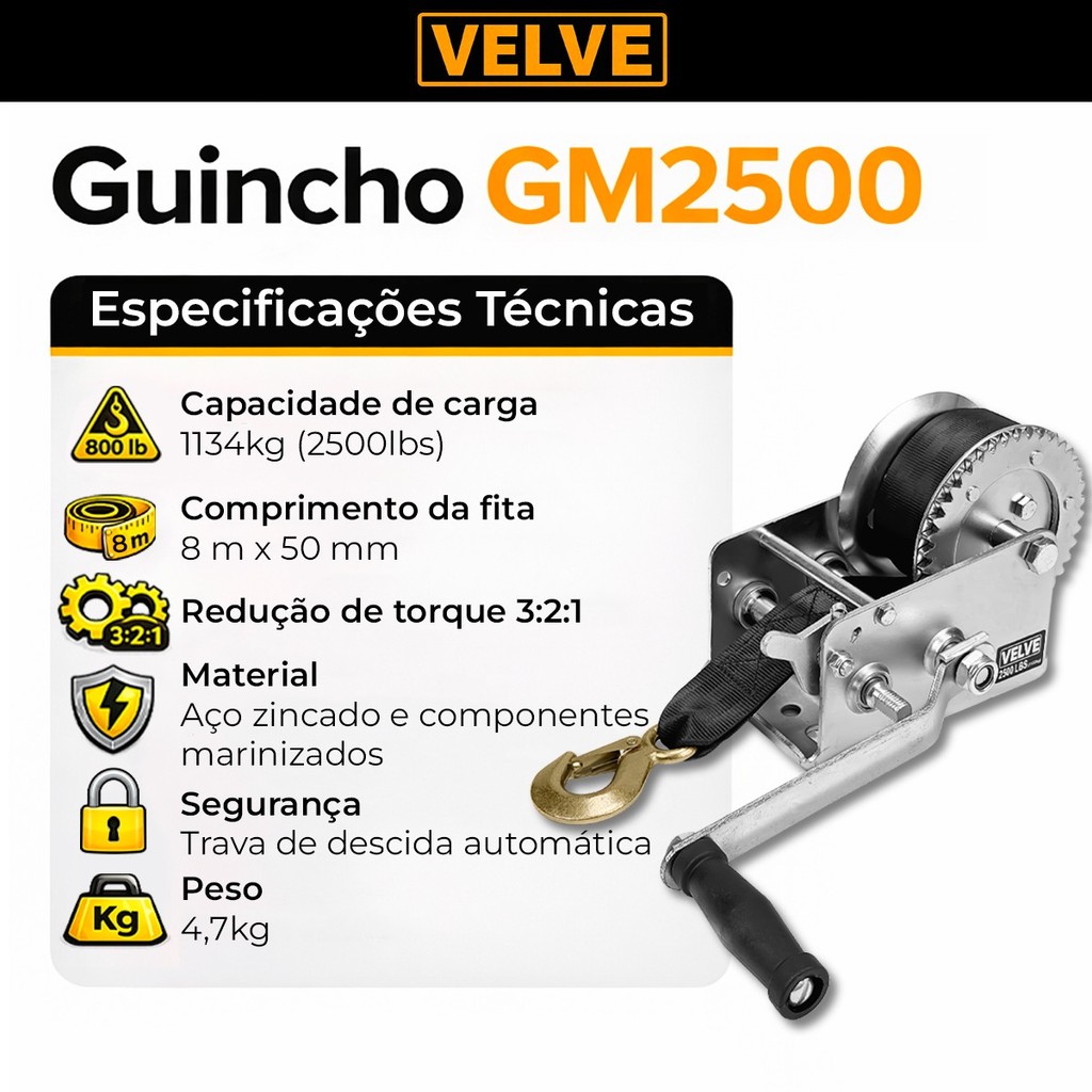 Guincho manual Velve GM2500A com catraca e cinta para até 2500lbs (1134kg).Especificações Técnicas:Capacidade máxima de arrasto: 1134kg;Comprimento da cinta: 8 metros;Diâmetro da cinta: 50mm;Carretel com 13cm de diâmetro x 9cm de altura.Dimensões do guincho: 23cmx17cmx17cm;Peso do guincho: 4,7kg.Itens Inclusos:1 Guincho Catraca GM2500A;1 Nota fiscal.