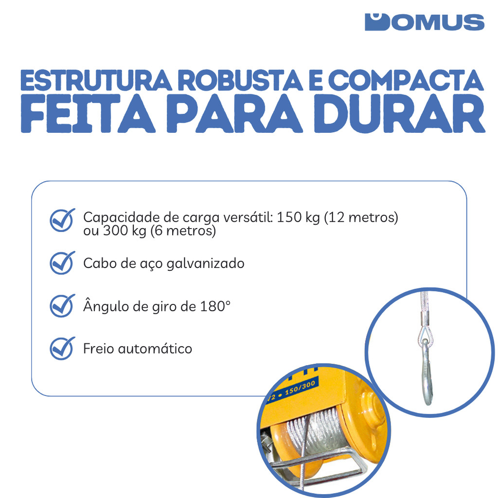 PRODUTO PRONTA ENTREGA COM ENVIO IMEDIATO Guincho Talha de Coluna Prime V2 150/300kg Motor 220V Monofásico Menegotti | Eficiência, Segurança e Alto Desempenho na Elevação de Cargas O Guincho de Coluna Elétrico Prime V2 Menegotti foi desenvolvido para quem busca praticidade e segurança na movimentação de cargas. Com capacidade para elevar até 150 kg em 12 metros ou até 300 kg em 6 metros, é ideal para oficinas, armazéns, poços, depósitos e pequenas construções. Possui motor monofásico de 650W para uso contínuo, estrutura reforçada em chapa de aço, carcaça do redutor em alumínio e cabo de aço galvanizado de alta resistência. Conta ainda com botoeira pendente, chave de emergência e sistema de fim de curso, garantindo segurança durante toda a operação. O freio automático é acionado por mola de compressão, oferecendo precisão e estabilidade na elevação. Diferenciais do produto: Suporta até 150 kg (12m) ou 300 kg (6m) Estrutura robusta com redutor em alumínio e proteção em chapa de aço reforçado Cabo de aço galvanizado de alta qualidade, não rotativo (19x7 AF) Motor monofásico 220V para uso contínuo Botoeira com chave de emergência e fim de curso automático Ângulo de giro de 180º, oferecendo mais flexibilidade na operação Alta produtividade, redução de esforço físico e mais segurança Informações técnicas: Modelo: Prime V2 150/300 kg Capacidade de carga: 150 kg (12m) ou 300 kg (6m) Velocidade de elevação: 10 metros em 5 minutos Potência do motor: 650W - Monofásico 220V - 60Hz Ângulo de giro: 180º Dimensões: 330 mm x 134 mm x 146 mm (C x L x A) Peso: 11,6 kg Conteúdo da embalagem: 1 Guincho Talha de Coluna Prime V2 150/300kg Menegotti Mais eficiência, segurança e produtividade na movimentação de cargas. Garanta já o seu!