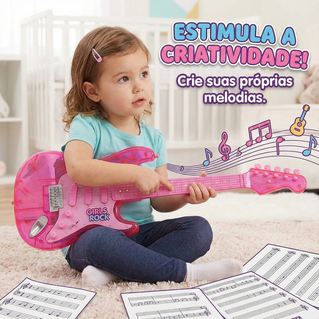 Guitarra Com Microfone Girls Rock Instrumento Brinquedo Musical Infantil Menina Violão Crianças Rosa Kizumba A Guitarra Infantil com Microfone é o brinquedo perfeito para estimular criatividade, musicalidade e imaginação. Com design encantador e plástico resistente, ela permite que as crianças se sintam verdadeiras estrelas do palco enquanto tocam ritmos, criam melodias e cantam com o microfone incluso. Com diversos efeitos sonoros, controle de volume e uma barra de balanço que produz sons especiais de guitarra, proporciona uma experiência musical divertida e educativa. Ideal para desenvolver coordenação motora, expressão artística e o interesse pela música desde cedo. Especificações Técnicas: • Modos: Ritmos solo ou criação de melodia • Teclas: 8 teclas musicais com diferentes sons de guitarra • Funções extras: Barra de cordas, barra de balanço, melodias demonstrativas, controle de volume, seleção de modo • Alto falante: Integrado • Conexão: Entrada para microfone • Alimentação: 3 pilhas AA de 1.5V (não incluídas) • Material: Plástico resistente • Idade recomendada: Não informada pelo fabricante Dimensões: • Comprimento: 57 cm • Altura: 5 cm • Largura: 22 cm FAQ (Perguntas Frequentes): 1. Ela vem com microfone? Sim, acompanha microfone para cantar junto. 2. Tem luzes? O fabricante não menciona luzes, apenas funções sonoras. 3. Funciona a pilha? Sim, utiliza 3 pilhas AA (não inclusas). 4. A guitarra é resistente? Sim, feita em plástico resistente ideal para uso infantil. Conteúdo da Embalagem: • 01 Guitarra Infantil • 01 Microfone • 01 Óculos Importante: Valor Unitário Imagens Meramente Ilustrativas Não nos responsabilizamos pelo mau uso do produto