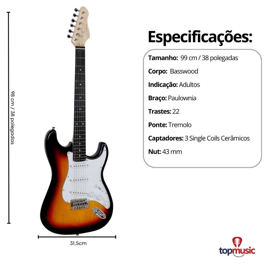 A série Standard traz para você nossos modelos com guitarras estilo Strato, com diferentes configurações de captação, com diferentes tipo de captação e circuitos. A Giannini G-100 apresenta 03 captadores single coils cerâmicos. Conta com tarraxas blindadas, tensor bi-direcional e nut de 42mm. Somos revendedor autorizado Giannini. Especificações: Escudo: Tortoise (TT) ou Branco (WH) Corpo: Poplar maciço Braço: Maple satinado com tensor bi-direcional Shape do braço: Formato C Escala: Techwood Comprimento da escala: 648 mm (25,5 polegadas) Trastes: 22 trastes médio jumbo em alpaca Ponte: Tremolo standard cromada com alavanca Tarraxas: Blindadas cromadass standard Giannini, 6L Pestana: ABS na cor marfim Largura da pestana: 42 mm Captadores: 3 single coils cerâmicos Chave: 5 Posições Controles: Volume/Tone/Tone Cordas: Aço .009 Acabamento: Verniz brilhante Tamanho total: 98 cm Acompanha: Chaves de ajuste para tensor/ponte Produto 100% original com garantia em todo Brasil.