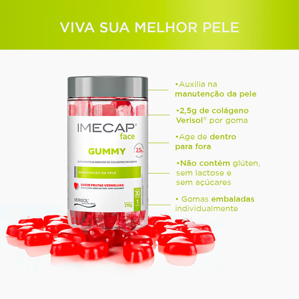 Imecap Face Gummy 30 Gomas - Colágeno Verisol em Gomas Sabor Frutas Vermelhas O que é e para que serve o suplemento Imecap Face Gummy? Imecap Face é um suplemento alimentar em gomas, formulado com col