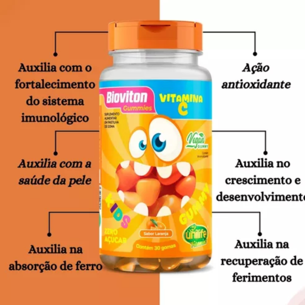 Bioviton Gummy Kids Vitamina C Sabor Laranja Unilife 30 gomas Lançamento da Unilife: Gummys Kids! Mais fácil de consumir! Conheça a linha Gummy Kids: uma forma prática e mais divertida de suplementar os nutrientes através das gominhas, evitando os comprimidos ou cápsulas, além de ter um sabor mais agradável. Essa é a pastilha de goma de Vitamina C, que pode auxiliar na formação do colágeno, na absorção do ferro que vem dos alimentos e muitos outros benefícios. Com sabor cítrico de Laranja! As gominhas são veganas, feitas com pectina gelificante e glaceante cera de carnaúba, 100% natural! Sem glúten, sem lactose e zero açúcar! A nova linha de Gomas (gummys) da Unilife é uma forma prática e mais palatável para consumir os benefícios de diversas Vitaminas, Minerais e outros elementos nutricionais. Sugestão de uso: Ingerir 1 (uma) goma ao dia. A Natuvip agradece pela preferência! Dúvidas, estaremos a total disposição no chat (seg-sex 8h-17h) ou deixe seu recado que em breve será respondido. Seu pedido será coletado em até 24hrs (de seg - sex) após a NF ser liberada pela plataforma.