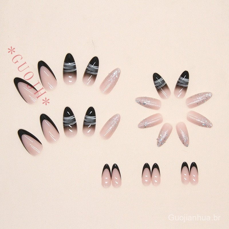 GUOJH unha postiça decorada realista amendoada francesinha Faíscas Com Cola Desenho De Linha