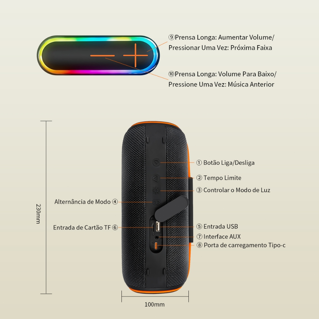 Caixa de som Bluetooth H'maston AM-38 É portátil e possui excelente qualidade de som, o que o torna ideal para uso em casa e durante viagens, passeios e muito mais. Performance do produto: 1. Conexão Bluetooth 5.3 e TWS: Novo Chip 5.3 recém atualizado torna a conexão mais fácil, o sinal é mais estável e a transmissão é mais rápida, permitindo que você aproveite a liberdade do wireless.E através da tecnologia TWS, você pode emparelhar duas caixas de som Bluetooth com seu celular ou computador para obter um verdadeiro som estéreo duplo aprimorado. 2. Chamadas de alta definição: Este caixa de som Bluetooth possui um microfone embutido, para que você possa atender chamadas mesmo se seu telefone não estiver por perto.Ele possui redução de ruído e é viva-voz,não há atraso durante as chamadas. 3. Bateria de longa duração: A bateria de grande capacidade de 3000mAh oferece de 6 a 8 horas de experiência musical, e o carregamento ultrarrápido de permite que você aproveite de uma experiência musical maravilhosa em apenas 2 horas de carregamento. 4. Efeitos de iluminação RGB e rádio FM: Este alto-falante Bluetooth vem com cinco efeitos de iluminação de cores RGB,você só precisa tocar música e essas luzes mudarão com a música,permitindo que você mergulhe nele e, assim, melhore seu prazer musical,ele vem com um botão de recepção de rádio FM, que recebe automaticamente a frequência com apenas um clique, permitindo que você tenha uma variedade de experiências auditivas. 5. IPX6 à prova d'água: IPX6 à prova d'água faz com que você não tenha mais medo de poeira, chuva forte e outros ambientes. 6. Fácil de transportar: Este alto-falante Bluetooth foi projetado com um cordão para fácil transporte.Você pode ouvir a qualquer hora e em qualquer lugar, adicionando uma experiência maravilhosa à sua viagem. 7. Ampla compatibilidade: Este caixa de som Bluetooth é compatível com diferentes modelos de dispositivos e é compatível com a conexão de Android, iPhone, tablets, laptops e outros dispositivos. Parâmetro: Modelo: Caixa de som Bluetooth H'maston AM-38 Bluetooth: V5.3 Capacidade da bateria: 3000mAh Tempo de carregamento: 3-4 hora Tempo de uso: 6-8 horas(70% do volume) Dimensões: 23 cm x 10 cm x 10 cm Conteúdo da embalagem: 1 Caixa de som Bluetooth 1 Cabo de dados para carregar caixa de som Bluetooth 1 Manual de instruções