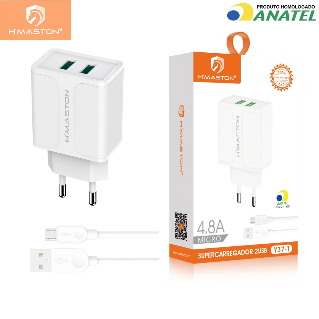 H'maston Y37 Carregador Turbo 2 Usb 4.8a Com Cabo Usb C V8 1 Metro