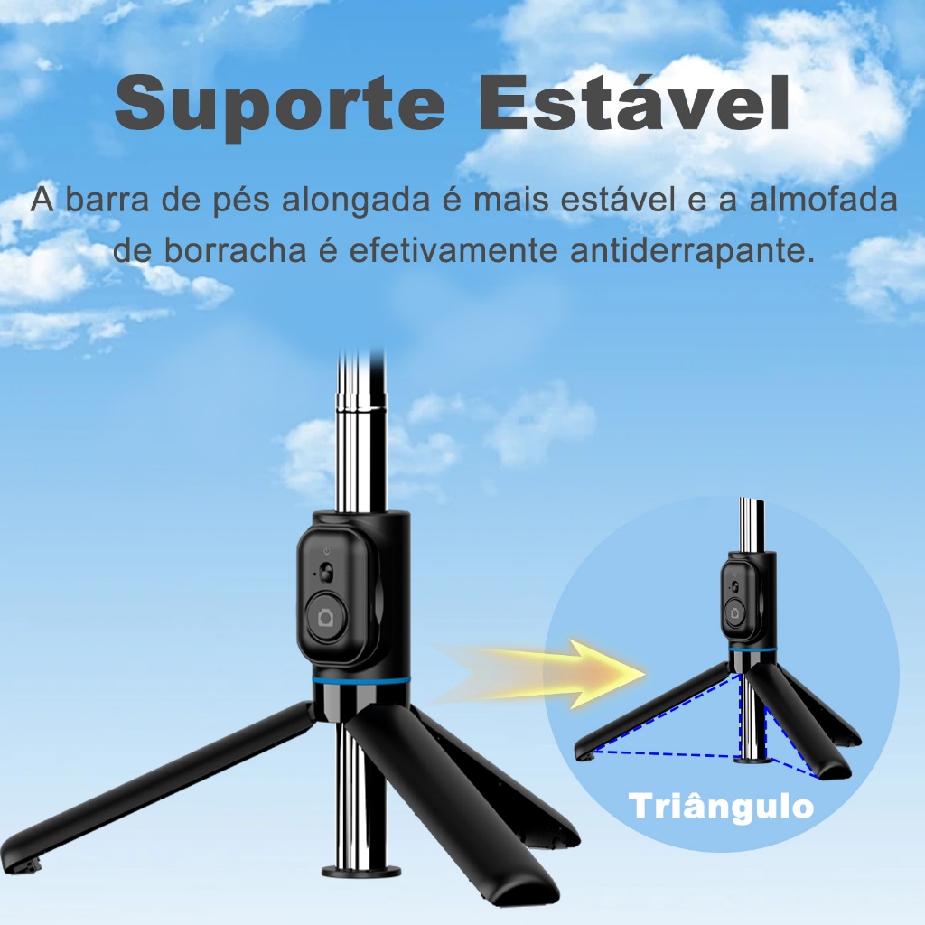 Rotação de 360° O selfie stick é uma ferramenta versátil projetada para máxima flexibilidade. Inclui um controle remoto sem fio e uma luz de preenchimento LED, O bastão pau de selfie Bluetooth tripé pode ser girado 360° e as telas horizontais e verticais podem ser usadas para fotografar para atender a diferentes necessidades de filmagem. Ajuste de altura superior Com uma capacidade de extensão de até 106 cm, este tripé ajustável oferece um amplo alcance de tiro. Ideal para selfies de corpo inteiro, fotos de grupo ou fotografia de paisagem, garante que você capture o ângulo perfeito sempre. Este recurso o torna uma ótima escolha para fotografia interna e externa. Portátil e leve para qualquer lugar Projetado para ser leve e compacto, este tripé portátil de bastão de selfie é fácil de carregar e armazenar. É o companheiro perfeito para entusiastas de viagens e criadores de conteúdo que precisam de um tripé de telefone confiável em movimento. Se você estiver caminhando, participando de eventos ou apenas para um passeio, este tripé adequado para viagens cabe facilmente em sua bolsa. Controle remoto sem fio conveniente O controle remoto Bluetooth sem fio permite que você capture fotos e vídeos a até 10 metros de distância, tornando-o ideal para fotos em grupo, selfies de viagem solo e gravação de vídeo com as mãos livres. Este tripé de telefone com controle remoto melhora sua capacidade de capturar perfeitamente todos os momentos sem a necessidade de pressionar manualmente o obturador. Luz de LED de alto brilho Com uma luz de preenchimento LED embutida, este tripé de bastão de selfie oferece iluminação suave e natural para melhorar suas fotos e vídeos, especialmente em ambientes com pouca luz. Perfeito para fotografia noturna, sessões internas ou para criar a iluminação perfeita para o seu conteúdo de mídia social. A luz LED garante que suas imagens estejam sempre claras e bem iluminadas.