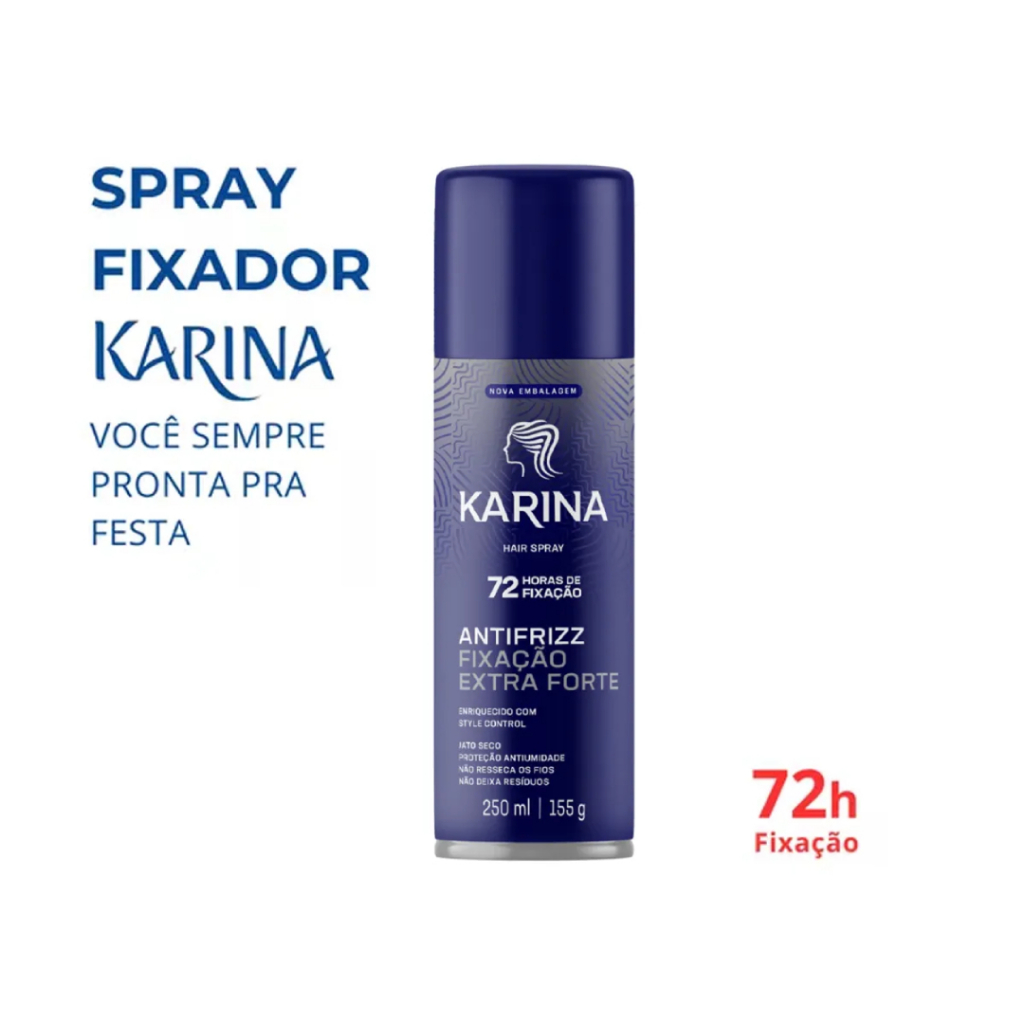 Hair Spray Fixador Karina Extra Forte 250ml Principais Características: • Fixação extra forte que mantém o penteado firme por muito mais tempo • Fórmula com pró-vitamina B5, que ajuda a proteger e hidratar os fios • Secagem rápida e aplicação uniforme, sem deixar resíduos visíveis Benefícios: • Garante alta durabilidade do penteado mesmo em ambientes úmidos • Ajuda a preservar a forma dos fios ao longo do dia • Confere brilho natural e aspecto saudável aos cabelos Diferenciais do Produto: • Ideal para penteados elaborados e ocasiões que exigem longa duração • Protege os fios do ressecamento causado por agentes externos • Versátil para todos os tipos de cabelo e estilos Especificações Técnicas: Peso: 250ml Instruções de Uso: Agite bem antes de usar. Pulverize o spray a uma distância de aproximadamente 20cm dos cabelos, distribuindo de maneira uniforme sobre o penteado desejado. Avisos e Precauções: Produto inflamável. Não aplicar perto do fogo ou em ambiente superaquecido. Evitar contato com os olhos. Em caso de irritação, suspender o uso. Manter fora do alcance de crianças. O que está incluso? 1 Hair Spray Fixador Karina Extra Forte 250ml ---- DÚVIDAS FREQUENTES ---- Os produtos são originais? Sim. Todos os nossos produtos são originais. Emitem nota fiscal? Sim. Emitimos nota fiscal para todos os pedidos.