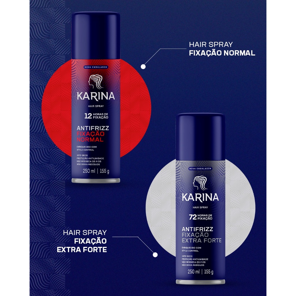 Hair Spray Karina Fixação Normal 400ml Karina vem acompanhando as conquistas e a evolução feminina, por isso entende bem os desafios e necessidades de uma rotina agitada. Pensando nisso desenvolvemos linhas de produtos práticos, versáteis e de alta performance, para ajudar nas finalizações diárias e potencializar a melhor expressão feminina. A marca conta com a Linha de Sprays de Fixação e Shampoos a seco. Os Hair Sprays Karina são os fixadores queridinhos das consumidoras. Eles ajudam a modelar os cabelos, mantendo os penteados firmes por mais tempo mesmo em ambientes de alta umidade, sem ressecar ou danificar o cabelo. Disponíveis em dois níveis de fixação, Normal e Extra Forte. BENEFÍCIOS: HAIR SPRAY KARINA FIXAÇÃO NORMAL - Ideal para penteados mais elaborados ou ocasiões especiais. 12h de Fixação; Enriquecido com Style Control, garante o controle dos fios; Proporciona brilho, proteção antifrizz e antiumidade; Não deixa resíduos, nem resseca os fios; Pode ser usado antes e depois do secador; Disponível nas volumetrias 250 e 400ml MODO DE USO: Vaporize nos cabelos leves jatos de modo contínuo e uniforme, a uma distância de aproximadamente 30cm. Ideal para ser utilizado durante a modelagem dos fios e na finalização, para reforçar a fixação e brilho. Se for utilizar o secador depois da aplicação do produto, recomenda-se o uso na temperatura média, a uma distância de aproximadamente 15cm. INDICAÇÕES DE USO: Ideal para penteados mais elaborados ou ocasiões especiais. CÓDIGO DO PRODUTO: 404404