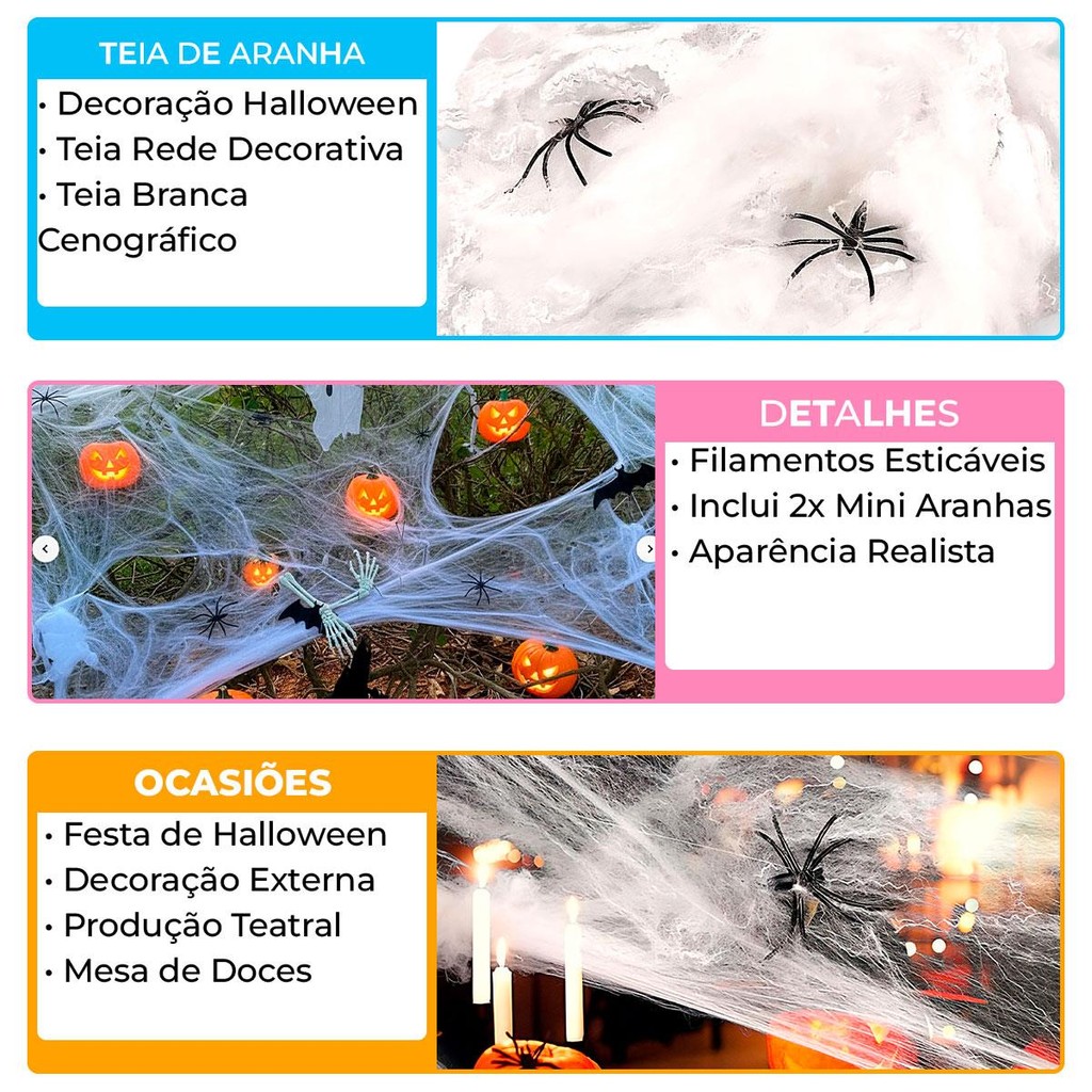 Itens inclusos:1x Teia Aranha Falsa 2x Mini Aranhas Dimensões do produto: Tamanho Tamanho Único. Especificações Técnicas Material:98% poliéster e 2% plástico Cor: Branca Produto a pronta entrega! Produto original! Dê um toque arrepiante à sua decoração com esta teia de aranha decorativa de 20g, feita em material leve e resistente. Produzida com poliéster e plástico, pode ser facilmente esticada para criar um efeito realista em mesas, paredes, portas e ambientes inteiros. Acompanha 2 mini aranhas decorativas, perfeitas para complementar a cena e deixar tudo ainda mais assustador. Ideal para festas de Halloween, Dia das Bruxas, eventos temáticos ou até mesmo vitrines, é um acessório versátil e indispensável para transformar qualquer espaço em um cenário de terror. Destaques do produto: Teia de aranha decorativa de 20g Acompanha 2 mini aranhas decorativas Pode ser esticada para maior cobertura e realismo Ideal para Halloween, Dia das Bruxas, vitrines e festas temáticas