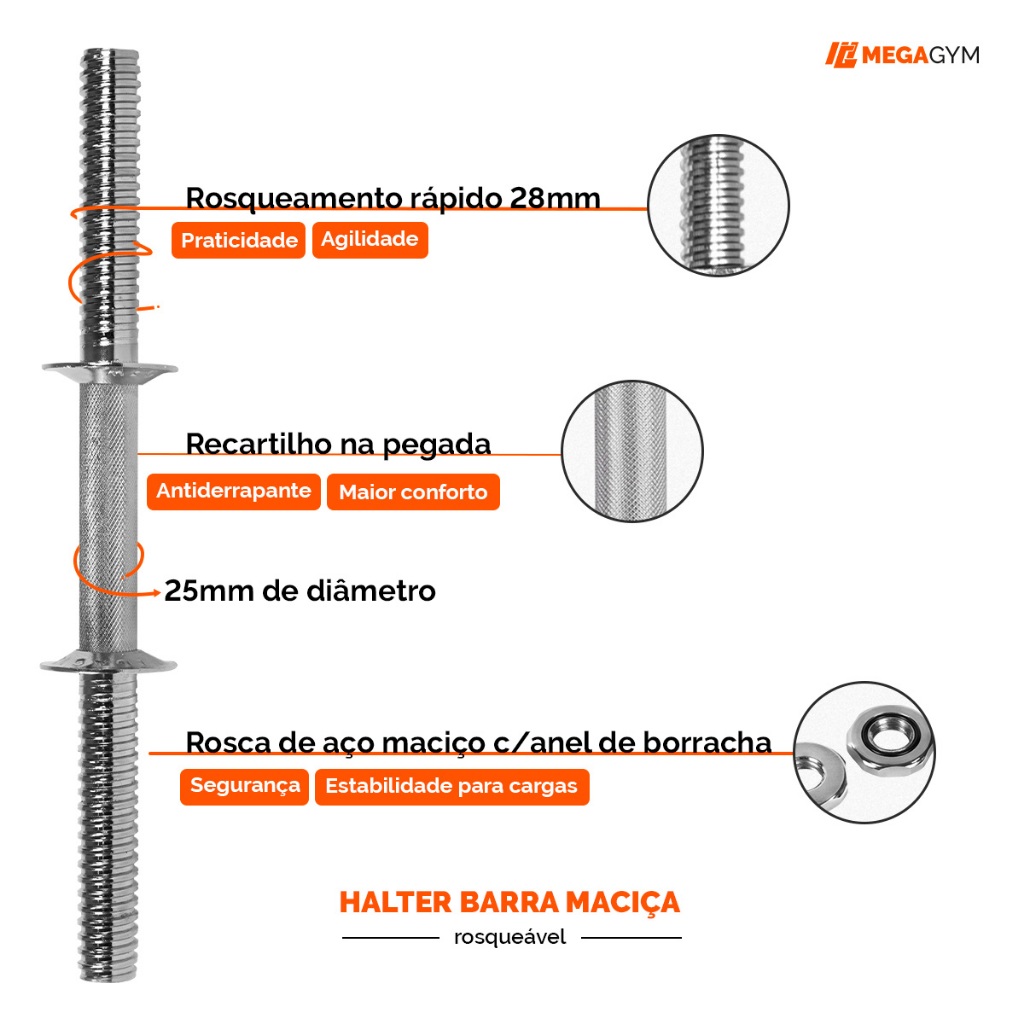 Halter Barra Maciça Rosqueável: O treino de musculação com halteres mais perfeito que você terá! Com alta qualidade de seu aço maciço e revestimento em cromo, nunca mais tenha preocupação com as ações da água e do suor. E seus recartilhos disponibilizados em suas pontas, você terá controle total em cada execução de seus exercícios. Não perca mais tempo e garanta agora o Halter Barra Maciça Rosqueável, o equipamento ideal para um treino de alta resistência. Supere seus limites e alcance resultados extraordinários! Benefícios: — Rosqueamento Rápido; — Produto Robusto; — Promove uma Atividade Motora Complexa; — Equilíbrio Simetria da Força Muscular; — Definição de Músculos; Características Do Produto: • Material Do Produto: Aço Maciço; • Revestimento Do Produto: Cromo; • Modelo: Halter Barra Maciça Rosqueável; Informações Técnicas: • Limite Máximo De Carga: 400kg; • Comprimento Da Barras: 35cm; • Diâmetro Da Barra: 25mm; • Área Das Anilhas: 25,55mm; • Método De Segurança: Rosqueamento; Itens Inclusos: — Halter Barra Maciça Rosqueável 35cm; — Porcas com Anéis de borracha; — Garantia: 3 Meses; — Marca: MegaGym Equipamentos Fitness; Exercícios: — Supino; — Remada; — Stiff; — Tríceps Francês; — Desenvolvimento;