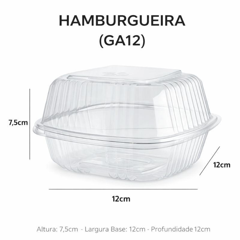 Modelo: GA12 Marca: Galvanotek Material: PET (Polietileno Tereftalato) cristal Cor: Transparente Capacidade aproximada: 500 ml Dimensões externas (aproximadas): Comprimento: 12,5 cm Largura: 12,5 cm Altura: 7 cm Formato: Quadrado com cantos arredondados Sistema de fechamento: Tampa fixa com encaixe firme (dobradiça), tipo clamshell Uso: Produto ideal para refrigeração, podendo ser empilhado Não recomendada para uso em micro-ondas ou forno