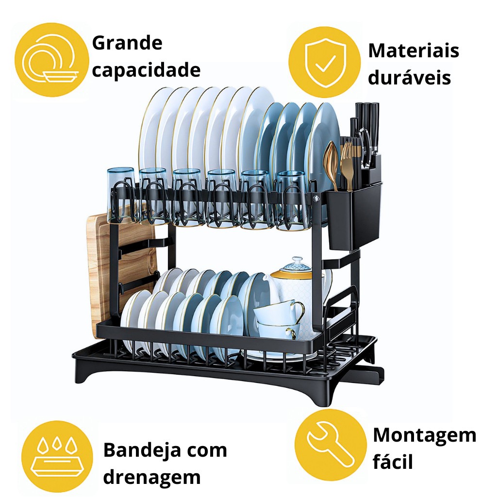 Prateleira de Prato de Aço Carbono Completo Otimize seu espaço de cozinha com um prato versátil, prático e elegante! Feito de aço carbono de alta qualidade, é resistente à ferrugem e durável, e seu design sofisticado complementa qualquer estilo de cozinha. ✨ Um All-in-One O escorredor de pratos foi projetado para atender a todas as suas necessidades. Possui um rack de tábua de corte, armazenamento dedicado para talheres, garfos e colheres, e um rack de vidro. Seja você armazenando placas, talheres, ou outros itens, eles serão organizados ordenadamente e de fácil acesso. 💧 Sistema de drenagem inteligente do sistema de drenagem inteligente A bandeja de gotejamento integrada coleta efetivamente água, evitando acúmulo e mantendo bancadas secas e limpas. É a escolha perfeita para quem valoriza a comodidade do dia a dia! 🌟 Espaçoso e compacto Embora compacto, este rack de pratos se encaixa em cozinhas de todos os tamanhos, mas oferece uma capacidade de armazenamento surpreendentemente grande. É perfeito para quem deseja maximizar o espaço disponível sem sacrificar a funcionalidade. 🛠️ Montagem e manutenção fáceis Este rack de pratos monta de forma rápida e intuitiva, e suas peças removíveis facilitam a limpeza e manutenção. É projetado para simplificar sua rotina diária. ⚙️ Especificações: Material: Aço carbono. Dimensões: 42 x 30 x 30 cm. Capacidade: Acomoda placas, talheres, óculos, tábuas de corte, e outros talheres. Este escorredor de pratos, combinando funcionalidade, durabilidade, e design moderno, revolucionará sua cozinha. Invista na organização e deixe seu espaço mais funcional e bonito!