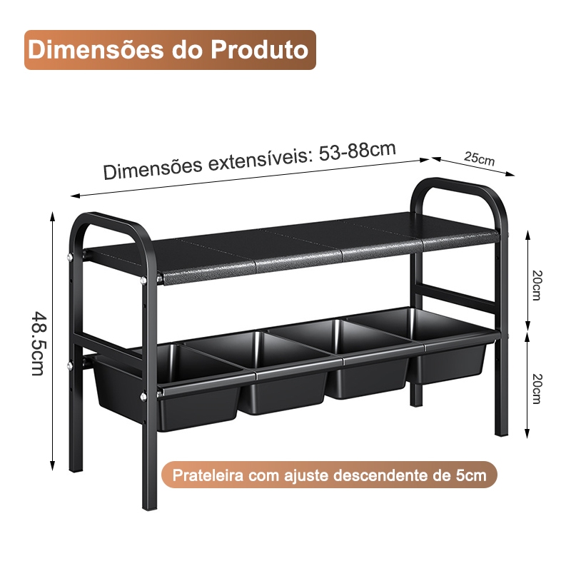 Este escorredor de pia extensível é o seu aliado ideal para organizar a cozinha, mantendo-a sempre arrumada e limpa. 🍳🍴 🔹 Design extensível: Ajuste o comprimento conforme a sua necessidade, adaptando-se a diferentes tamanhos de armários e pias, economizando espaço e criando uma solução de armazenamento flexível! 📏🛠️ 🔹 Armazenamento multifuncional: Além de acomodar panelas e frigideiras, também pode ser usado para guardar produtos de limpeza, detergentes, etc., dando a cada pequeno item um lugar específico e dizendo adeus à bagunça! 🍲🍶 🔹 Design com prateleiras em níveis: A estrutura com níveis facilita a categorização e organização, permitindo que você encontre facilmente os itens que precisa e evite perdê-los. Adquira o seu agora! 🔑🔝 🔹 Material durável: Feito com materiais de alta qualidade, resistente e durável, à prova d'água e resistente à umidade, ideal para ambientes úmidos de cozinha, com longa vida útil! 🛠️💪 🔹 Fácil instalação: Sem necessidade de ferramentas, fácil de limpar e otimiza o espaço de armazenamento da sua cozinha! 🏡🔧 Suporte de carga:80kg Dimensões(L x C x A):53-88X25X48.5 CM Tamanho de expansão:53 - 88CM As prateleiras podem ser ajustadas para cima e para baixo em 5 CM. Cor: Preto Deixe este suporte de armazenamento ajudar você a organizar sua cozinha, tornando cada sessão na cozinha mais fácil e prazerosa! 🍽️🌟