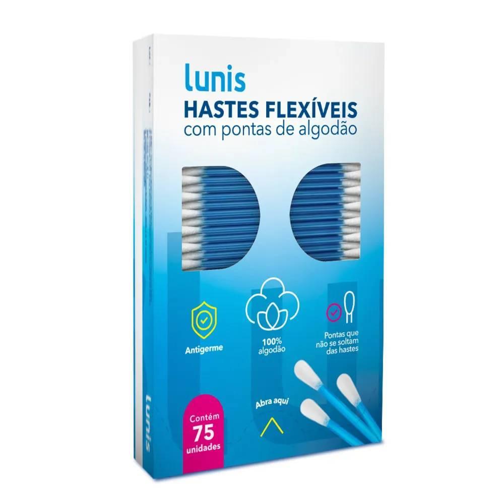 *Produto Original* *Atenção:* Venda exclusiva para pessoa física. Pedidos com CNPJ serão cancelados. Kit com 3 caixas de 75 unidades cada. totalizando 225 hastes flexíveis. As hastes flexíveis Lunis são aliadas na higiene diária de toda família. Produzidas dentro de um alto padrão tecnológico, são inquebráveis e suas pontas não se desprendem nem soltam fiapos, quando utilizadas corretamente. O algodão recebe um tratamento antigerme, que mantém livre de micróbios. Versatilidade de uso: para a higiene das áreas sensíveis como orelhas, umbigo, olhos e nariz, para aplicação de maquiagem e outras inúmeras utilidades. Uso externo e único.