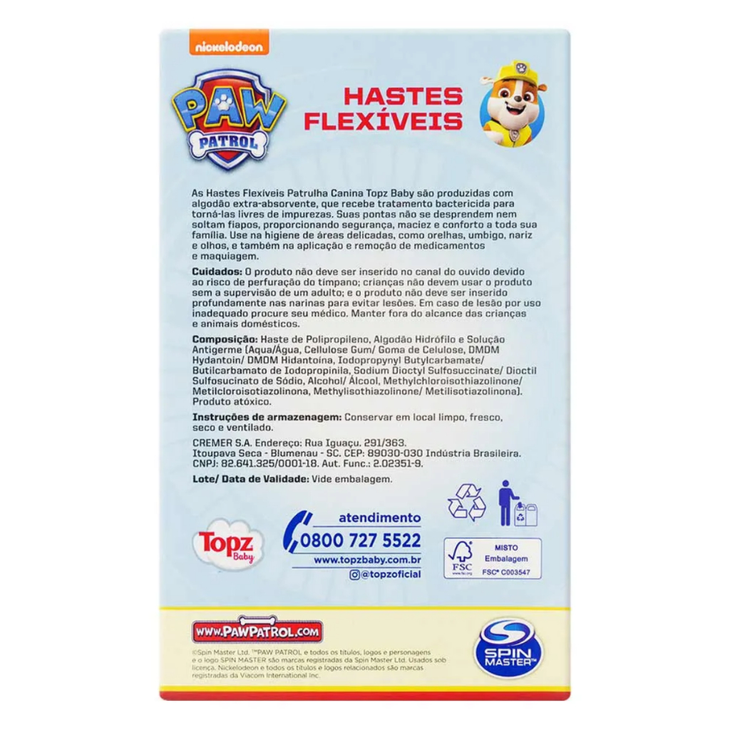 Hastes Flexíveis Topz Patrulha Canina - Cartela com 75 Unidades As Hastes Flexíveis Topz Patrulha Canina foram desenvolvidas para oferecer praticidade e segurança no dia a dia, contando com um design temático divertido para agradar crianças e adultos. Principais Características: - Ponta de algodão ultra macia: Proporciona maior conforto e segurança durante o uso. - Haste flexível resistente: Evita quebras e garante um manuseio seguro. - Embalagem temática da Patrulha Canina: Design atrativo para crianças, tornando o momento do cuidado mais divertido. Benefícios: - Auxilia na higiene pessoal, facilitando a limpeza de regiões sensíveis como orelhas e nariz. - Pode ser utilizada para aplicação de cosméticos e remoção de maquiagens. - Produto testado dermatologicamente, garantindo segurança no uso. Diferenciais do Produto: - Design exclusivo com personagens da Patrulha Canina. - Algodão puro, garantindo maciez e absorção. - Produzido com materiais de alta qualidade para um uso seguro e eficiente. Especificações Técnicas: - Quantidade: 75 unidades - Material: Algodão 100% puro nas pontas Instruções de Uso: - Utilize as hastes flexíveis com cuidado para limpar regiões sensíveis, evitando a introdução em locais internos, como o canal auditivo. - Para remoção de maquiagens ou aplicação de cosméticos, utilize a ponta de algodão para maior precisão. - Descarte a haste após o uso. Avisos e Precauções: - Uso externo. Não introduzir no canal auditivo ou nas narinas. - Mantenha fora do alcance de crianças. - Produto descartável. Não reutilizar. O que está incluso? - 1 cartela com 75 unidades de Hastes Flexíveis Topz Patrulha Canina. ---- Dúvidas Frequentes ---- Os produtos são originais? Sim. Todos os nossos produtos são originais. Emitem nota fiscal? Sim. Emitimos nota fiscal para todos os pedidos.