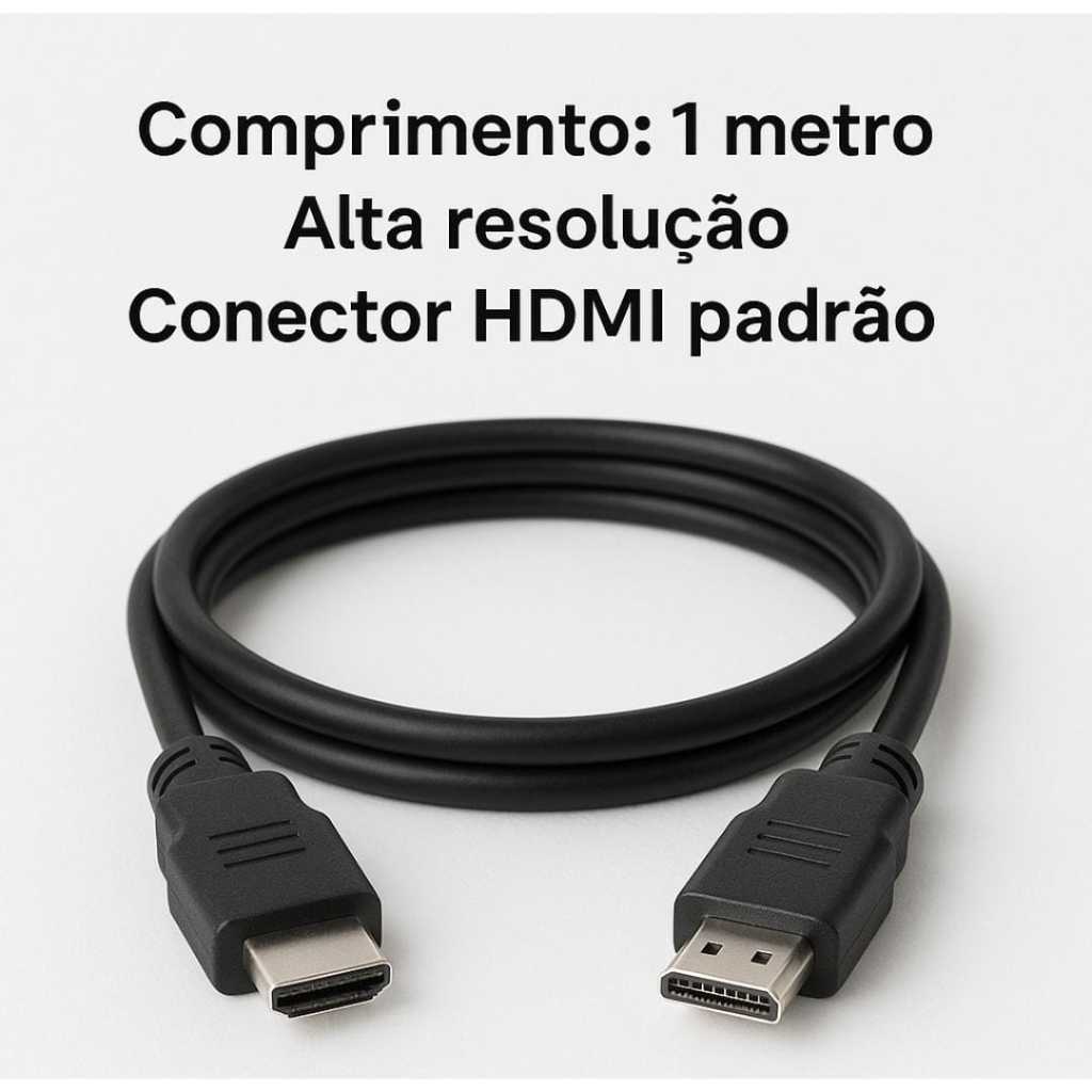 Cabo HDMI - Imagem em Alta Definição com Qualidade Profissional Conecte seus dispositivos com praticidade e qualidade! O cabo HDMI é ideal para ligar TVs, monitores, videogames e outros eletrônicos com resolução em Full HD 1080p. Especificações: Comprimento: 1 metro Cor: Preto Conector HDMI padrão Resolução: Até Full HD 1080p Compatível com: TVs, monitores, notebooks, vídeo games, DVD, projetores e mais Plug & Play – É só conectar e usar Produto novo, enviado embalado no plástico Vantagens: Transmissão de vídeo e áudio com alta qualidade Prático para espaços pequenos Ideal para uso doméstico ou profissional Envio rápido e seguro. Pronta entrega!