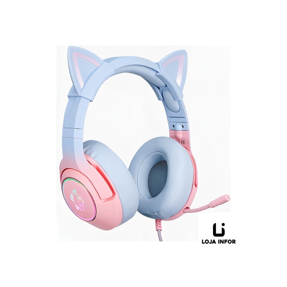 Headset Gamer Para Jogos Onikuma K9 RBG Luzes Orelha de Gatinha Removivel Microfone Retratil Bicolor Celeste e Rosa