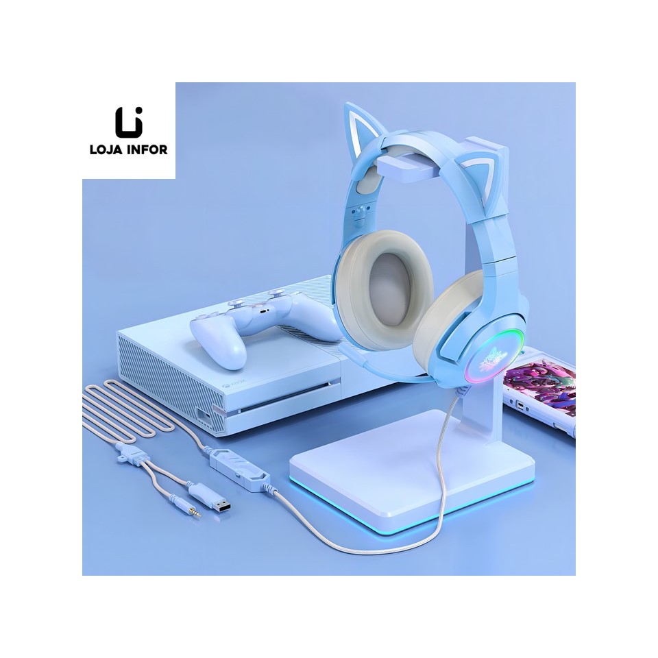 Headset Gamer Profissional Para Jogos Onikuma K9 RBG Luzes Orelha Gatinha Removivel Microfone Retratil Cor Azul Celeste