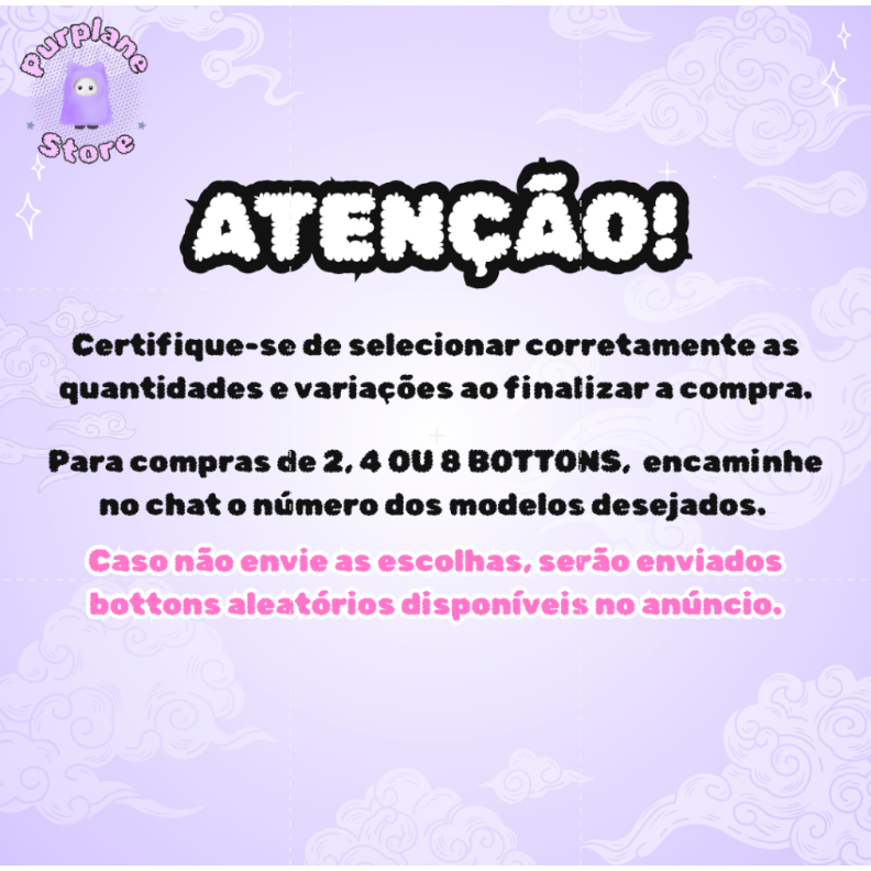 COMPRAS DE 2, 4 OU 8 BOTTONS: Encaminhar no chat o número dos modelos desejados. Caso não envie, serão enviados bottons aleatórios disponíveis no anúncio. Informações sobre o produto: - Tamanho: 4,5 cm - Bottom de ALFINETE - Acabamento em plástico brilhante PRODUTO FANMADE, DE FÃ PARA FÃ.