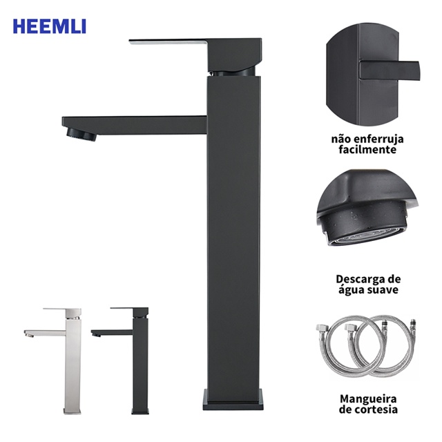 Heemli torneira banheiro inox monocomando Lavabo Saída Alta para Cuba Quadrado Pintura Preta Ajuste Água Quente Fria