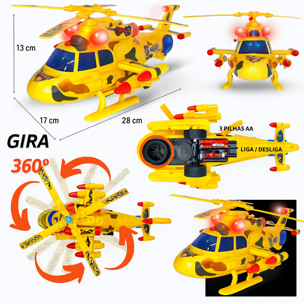 HELICÓPTERO DE BRINQUEDO COM LUZES SKY PILOTO – BRINQUEDO DE MENINO Prepare-se para muita diversão com o Helicóptero de Brinquedo Sky Piloto! Com luzes vibrantes e um design incrível, esse brinquedo vai conquistar os pequenos pilotos. Características Principais: Hélice que Gira: A hélice do helicóptero gira de forma realista, trazendo ainda mais emoção para as brincadeiras! Luzes Brilhantes: O helicóptero possui luzes que brilham enquanto voa, tornando a diversão ainda mais encantadora! Movimentação Bate e Volta: O helicóptero se move de forma interativa, indo para frente e voltando, garantindo muitas horas de entretenimento! Giro 360°: Realiza giros completos em torno de seu próprio eixo, proporcionando manobras radicais! Esse brinquedo é perfeito para os pequenos que adoram explorar e se divertir com seus próprios veículos aéreos! Alimentação: 3 pilhas AA (não Inclusas) Tamanho: 13 cm Altura. 17 cm Largura, 28 cm Comprimento Garanta agora o Helicóptero Sky Piloto e leve seu brinquedo a novos voos de diversão!