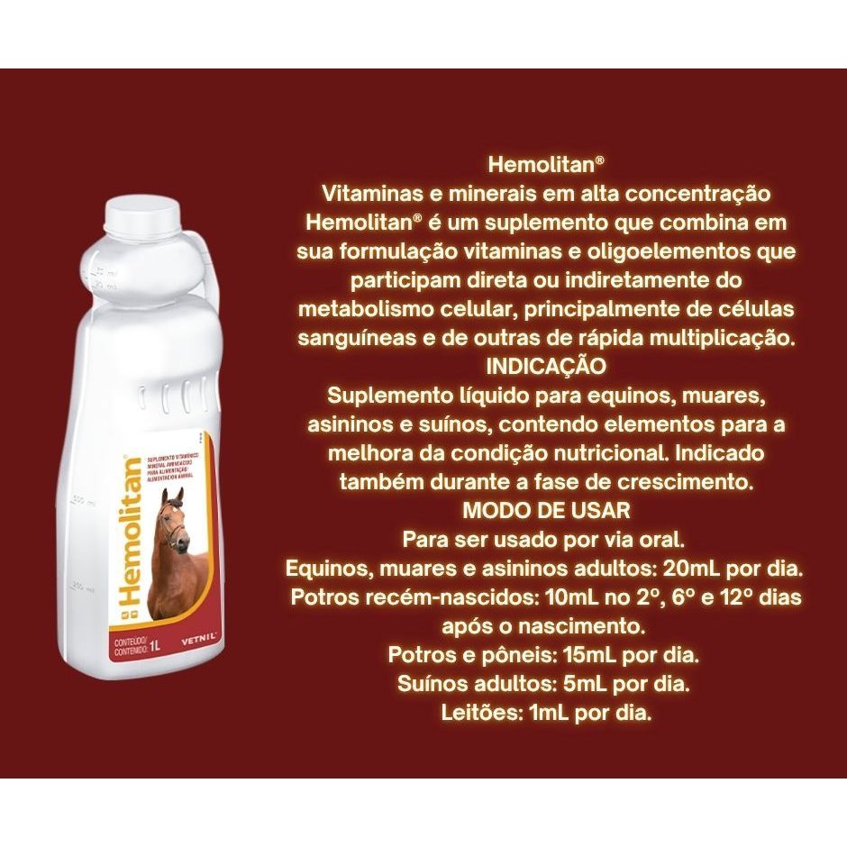 Hemolitan® é um suplemento que combina em sua formulação vitaminas e oligoelementos que participam direta ou indiretamente do metabolismo celular, principalmente de células sanguíneas e de outras de rápida multiplicação. INDICAÇÃO Suplemento líquido para equinos, muares, asininos e suínos, contendo elementos para a melhora da condição nutricional. Indicado também durante a fase de crescimento. MODO DE USAR Para ser usado por via oral. Equinos, muares e asininos adultos: 20mL por dia. Potros recém-nascidos: 10mL no 2º, 6º e 12º dias após o nascimento. Potros e pôneis: 15mL por dia. Suínos adultos: 5mL por dia. Leitões: 1mL por dia. NÍVEIS DE GARANTIA POR kg DO PRODUTO Vitamina B1 (Mín.)1.500 mgVitamina B2 (Mín.)1.500 mgVitamina B6 (Mín.)1.200 mgVitamina B12 (Mín.)15.000 mcgVitamina K3(Mín.)250 mgPantotenato de cálcio (Mín.)1.200 mgÁcido nicotínico (Mín.)1.200 mgÁcido fólico (Mín.)5.000 mgFerro (Mín.)4.500 mgCobalto (Mín.)100 mgCobre (Mín.)500 mgZinco (Mín.)5.000 mgGlicose (Mín.)200 g APRESENTAÇÃO Frasco dosador de 1L e refil de 5L. * Produto considerado NO DOPING segundo lista da FEI (Federação Equestre Internacional). Porém, sempre consultar regulamento específico da prova.