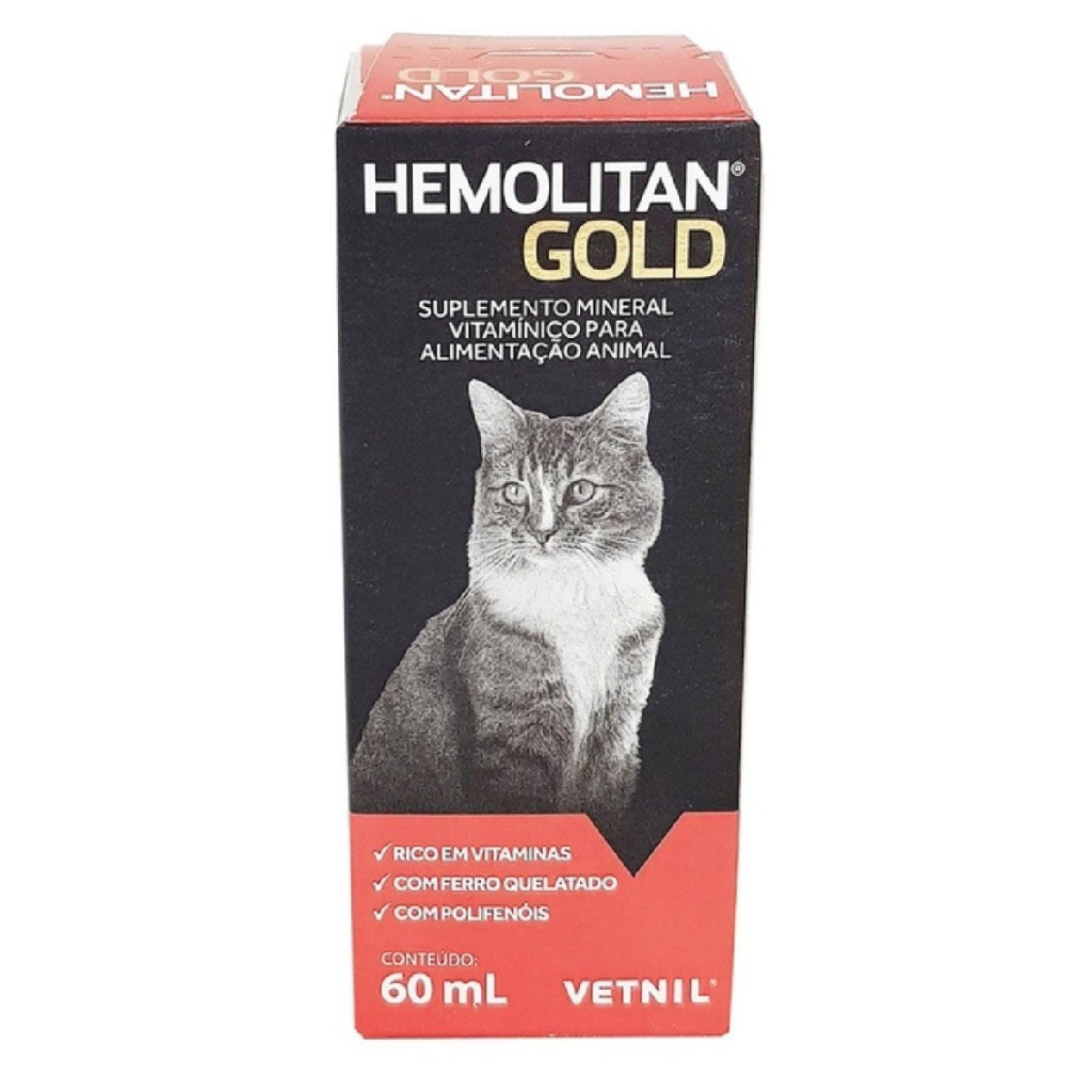 Hemolitan Gold Suplemento Vitamínico Para Animais 30mL - Vetnil O Hemolitan Gold Suplemento Vitamínico da Vetnil é um suplemento nutricional de alta qualidade desenvolvido para melhorar a saúde geral dos animais, com ênfase no sistema sanguíneo e na recuperação de quadros de anemia ou deficiências vitamínicas. Com 30 mL, esta fórmula líquida é altamente palatável e eficaz no suporte nutricional para cães, gatos, e outros animais, ajudando na formação de hemoglobina e no aumento da energia e disposição. Enriquecido com ferro, vitamina B12, ácido fólico e vitamina C, o Hemolitan Gold é indicado para animais que apresentam sinais de anemia, falta de apetite, fraqueza ou cansaço excessivo. Sua composição ajuda na produção de glóbulos vermelhos, essencial para a saúde do sistema sanguíneo e para garantir a boa oxigenação dos órgãos vitais, melhorando a qualidade de vida do seu pet. Composição e Benefícios:Ferro: Essencial para a formação de hemoglobina e transporte de oxigênio no sangue, sendo fundamental no combate à anemia e na melhora da energia e vitalidade do animal.Vitamina B12: Importante para a produção de células sanguíneas, ajuda no aumento do apetite, disposição e no bom funcionamento do sistema nervoso.Ácido fólico: Contribui para a formação de glóbulos vermelhos e para a melhora da oxigenação dos tecidos, reduzindo a fadiga e promovendo mais energia ao seu pet.Vitamina C: Potente antioxidante, auxilia na proteção das células, melhora a imunidade e contribui para a saúde geral do animal, além de aumentar a absorção do ferro.Fórmula líquida: A apresentação líquida facilita a administração, principalmente para animais com dificuldade de ingestão de comprimidos ou cápsulas.Suporte completo: Ideal para a recuperação de cirurgias, doenças ou quadros de debilidade nutricional, proporcionando os nutrientes essenciais para a recuperação rápida e eficaz.Indicações:Anemia e deficiências vitamínicas em cães, gatos e outros animais.Recuperação de cirurgias ou doenças que afetaram o sistema sanguíneo e a saúde geral.Falta de apetite, cansaço excessivo e sinais de fraqueza em animais de todas as idades.Animais com dificuldade em se alimentar ou em casos de doenças crônicas que afetam a absorção de nutrientes.Como suporte nutricional para animais em gestação, lactação ou fase de crescimento.Modo de Uso:Cães e gatos pequenos (até 5 kg): 1 mL por dia.Cães e gatos médios (5-10 kg): 2 mL por dia.Cães e gatos grandes (acima de 10 kg): 3 mL por dia.Pode ser administrado diretamente na boca do animal ou misturado à ração ou água.Conteúdo:1 frasco de Hemolitan Gold Suplemento Vitamínico para Animais com 30 mL.Proporcione ao seu pet o suporte vitamínico completo com o Hemolitan Gold Suplemento Vitamínico Para Animais. Com sua fórmula rica em nutrientes essenciais como ferro, vitaminas B12 e C, e ácido fólico, este suplemento ajuda a combater a anemia, aumentar a energia e melhorar a saúde geral do seu animal, garantindo mais vitalidade e disposição para o seu dia a dia.