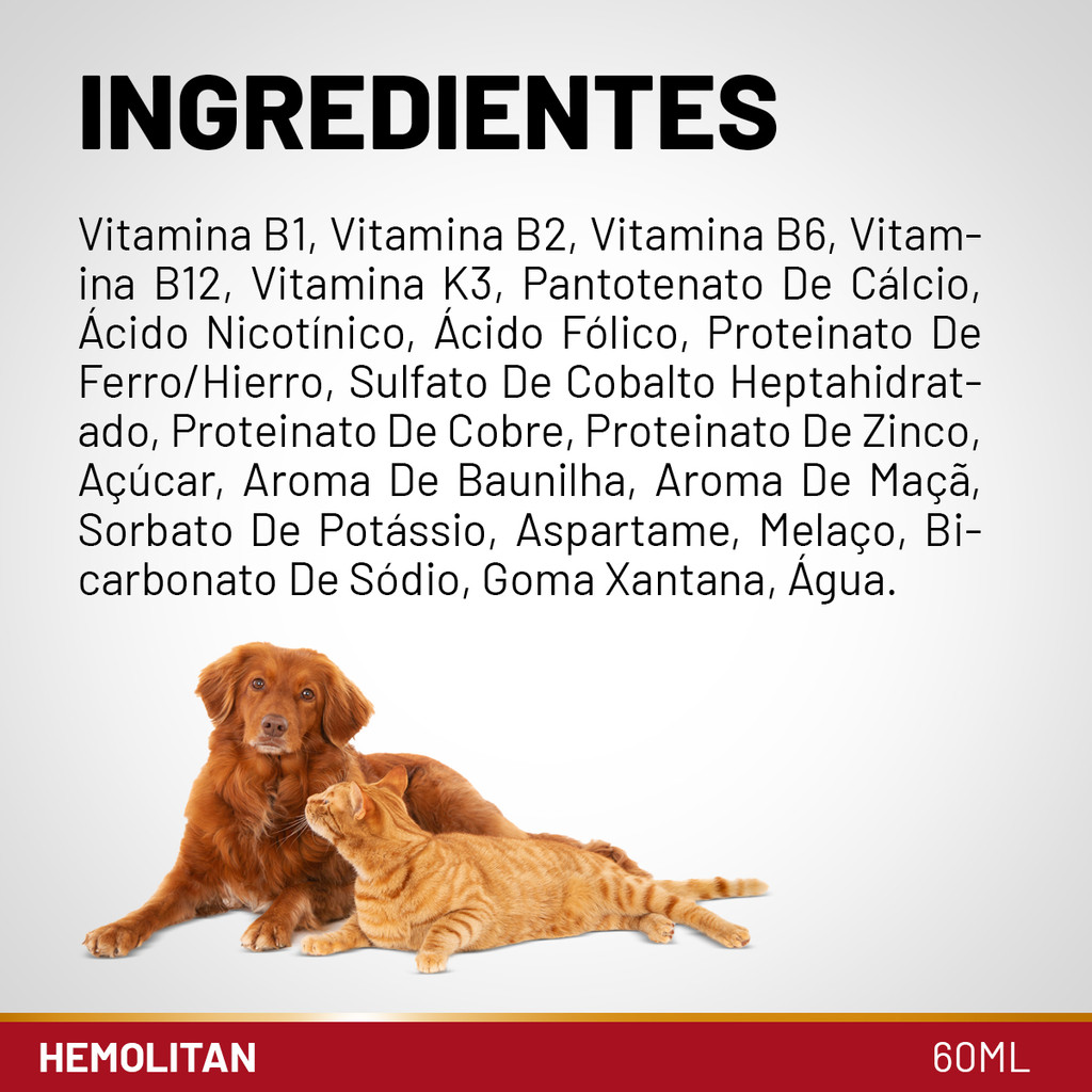 Hemolitan Pet combina em sua formulação vitaminas e oligoelementos que participam direta ou indiretamente do metabolismo celular, principalmente de células sanguíneas e outras de rápida multiplicação. INDICAÇÃO Suplemento líquido para caninos, felinos, mustelídeos, aves, roedores e répteis, contendo elementos essenciais para a melhora do estado nutricional. Também indicado durante a fase de crescimento dos animais. MODO DE USAR Para ser usado por via oral. • Caninos, felinos e mustelídeos: administrar 1 gota por kg de peso corporal, duas vezes ao dia, ou 1 mL para cada 10 kg de peso corporal, duas vezes ao dia. • Aves, roedores e répteis: diluir 20 gotas em um litro de água de bebida, ou 2 gotas em 100 mL de água. NÍVEIS DE GARANTIA POR kg DO PRODUTO Vitamina B1 (Mín.) 1.500 mg Vitamina B12 (Mín.) 15.000 mcg Vitamina B2 (Mín.) 1.500 mg Vitamina B6 (Mín.) 1.200 mg Vitamina K3 (Mín.) 250 mg Ácido Fólico (Mín.) 5.000 mg Ácido Nicotínico (Mín.) 1.200 mg Cobalto (Mín.) 100 mg Cobre (Mín.) 500 mg Ferro (Mín.) 4.500 mg Pantotenato de Cálcio (Mín.) 1.200 mg Zinco (Mín.) 5.000 mg Glicose (Mín.) 200 g