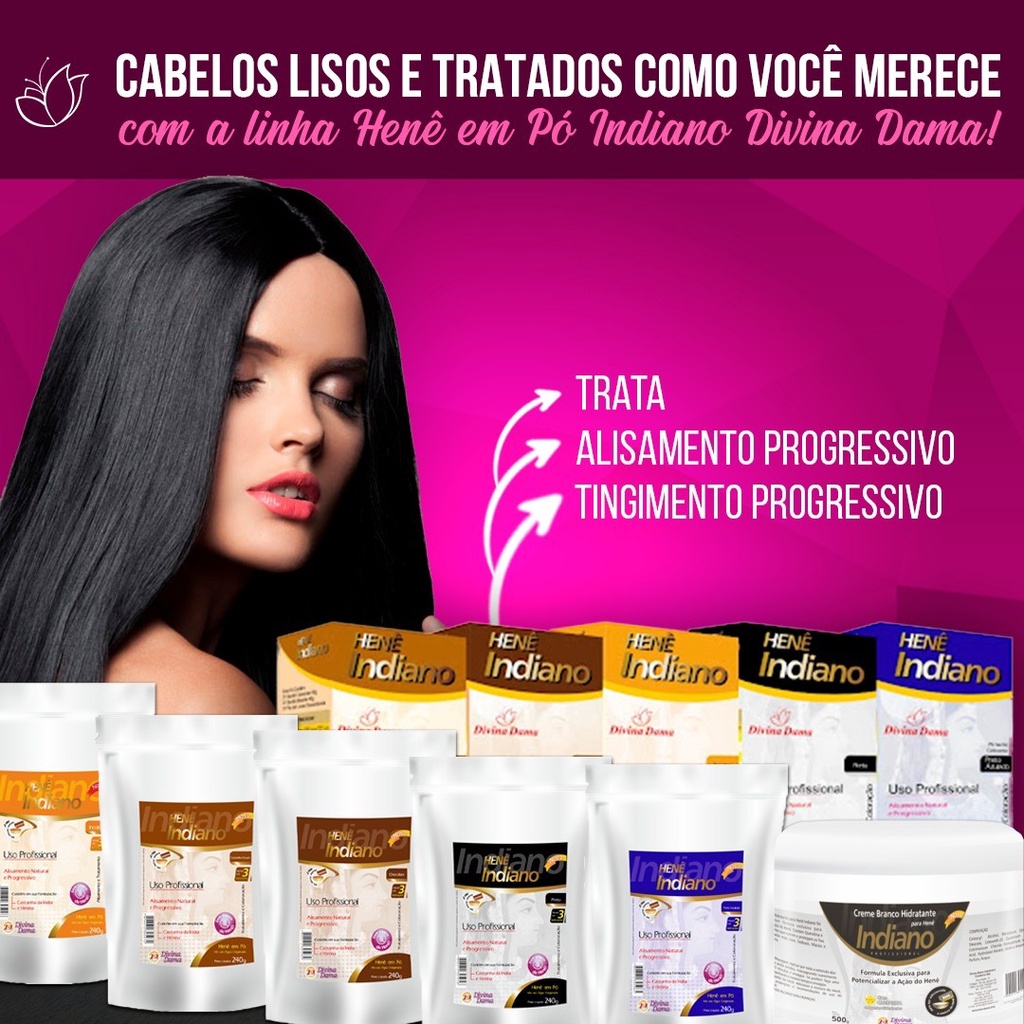 Somos o iSalão, Fazemos parte de um grupo com muitos anos no mercado de perfumaria. Garantimos a procedência de tudo que vendemos. Pode confiar. HENÊ EM PÓ ( 240g ) VERSÕES: PRETO – PRETO AZULADO – CHOCOLATE – CASTANHO ESCURO ESCUROMODO DE USAR: Aplique o produto sobre os cabelos limpos. Ponha em um recipiente não metálico todo o conteúdo dos sachês alisante e colorante e adicione 2 (duas) colheres de sopa do Creme Branco Hidratante Indiano. Se a mistura ficar muito consistente, coloque mais ½ colher de sopa de Creme. Aplique nos cabelos mecha por mecha, cubra-os de preferência com touca térmica e deixe agir de 1 (uma) a 2 (duas) horas. Em seguida, remova o Henê Indiano lavando os cabelos com shampoo. Enxágüe. Se preferir um liso mais intenso e duradouro, finalize com escova ou prancha.Importante: Antes de aplicar o produto leia atentamente as precauções e faça a Prova de Toque e Teste de Mecha. Esclarecimentos: – O Henê Indiano Divina Dama é compatível com qualquer tipo de henê. – Se você já usou coloração, poderá aplicar o Henê Indiano Divina Dama na cor similar a que já havia sido aplicada. – O Henê Indiano Divina Dama não tem poder de clarear os cabelos. Para uma melhor orientação fique atenta a tabela de cores.Aplicação e Resultados