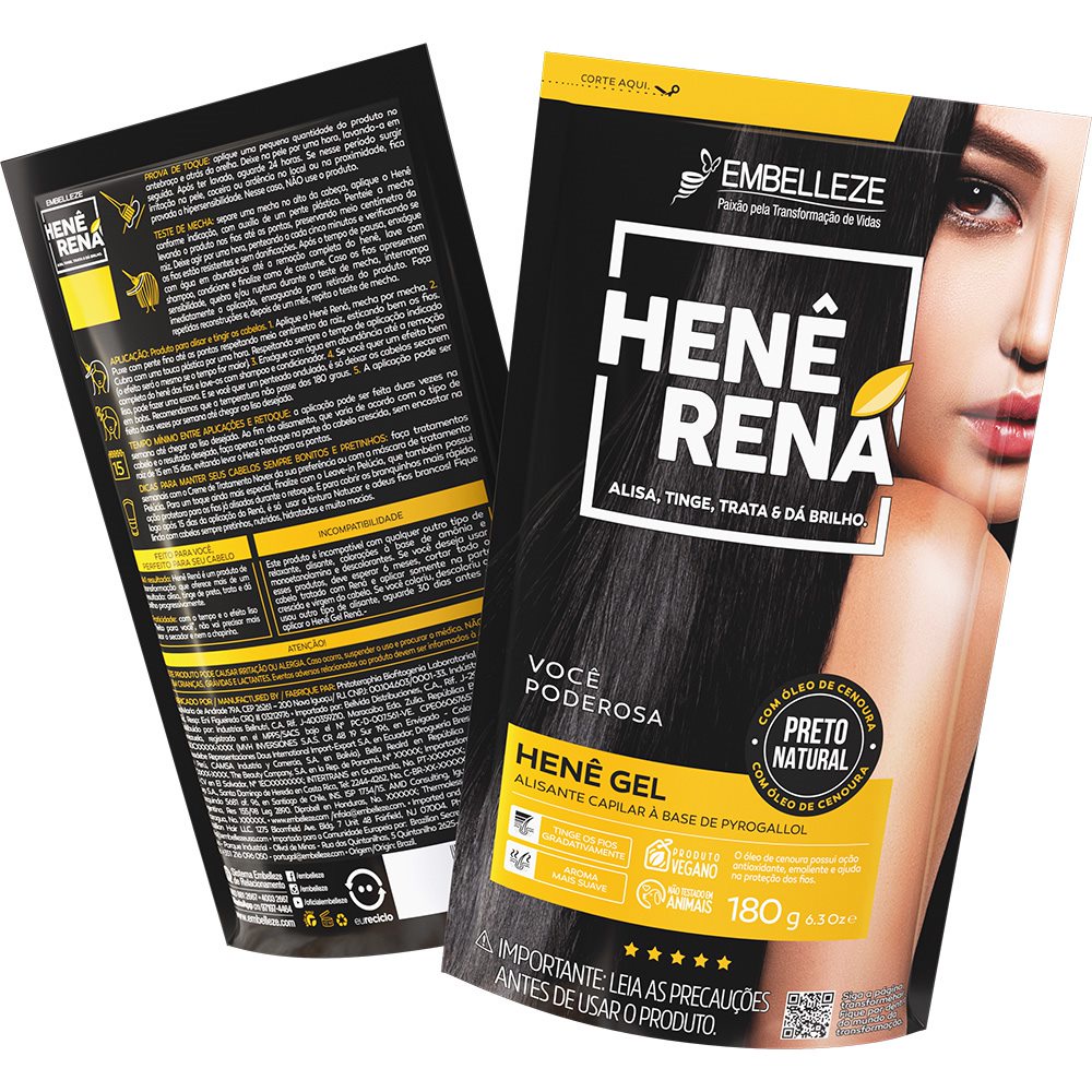 Detalhes Uma atitude que vem do jeito de ser. Vem da vontade de se destacar e de encantar. Uma exuberante Morena, cheia de beleza, força e paixão. Naturalmente Poderosa. Assim como esse Henê Rená que agora é seu mais fiel companheiro, aquele que vai trazer para você o poder do liso, a personalidade da cor e o fascínio do brilho. Afinal toda Morena Poderosa nasceu para brilhar! Características: INDICAÇÃO IMPORTANTE: Este produto é incompatível com qualquer outro tipo de relaxante, alisante, colorações à base de amônia e descolorantes. Se você deseja usar estes produtos, deve esperar 6 meses, cortar todo cabelo tratado com Rená e aplicar somente na parte crescida e virgem do cabelo. Se desejar cobrir cabelos brancos, recomendamos nossa coloração Natucor, livre de água oxigenada e amônia. Se você coloriu, descoloriu ou usou outro tipo de alisante, aguarde 30 dias antes de aplicar o Henê Gel Rená. Não é recomendado para gestante. AÇÃO Alisa progressivamente, pinta de preto e dá brilho aos cabelos. ATIVOS Com Jaborandi e Karité. Com essência exclusiva para um liso perfumado. BENEFÍCIOS Seus cabelos mais lisos, sedosos, cheios de brilho e movimento a cada aplicação. RESULTADO Você sempre linda e confiante faça chuva ou faça sol! MODO DE USO Veja como é fácil aplicar o henê Rená 1 - Use um creme para proteger a orelha, testa e nuca. 2 - Use luvas e proteja os ombros com capa ou toalha. 3 - Aplique mecha por mecha. Puxe com um pente de dentes finos, da raiz às pontas, esticando bem. 4 - Cubra os cabelos com touca plástica e deixe agir por 60 minutos. 5 - Enxágue bem até retirar todo o produto e em seguida lave com shampoo. 6 - Enxágue e condicione os cabelos. Finalize escovando ou com bobs. COMPOSIÇÃO AQUA, ZEA MAYS (CORN) STARCH, MANIHOT UTILISSIMA STARCH, AMMONIUM CHLORIDE, PYROGALLOL, CUPRIC CHLORIDE, SODIUM BENZOATE, PARFUM, LINALOOL, FERROUS SULFATE, SODIUM HYDROXIDE, CI 77266, BUTYROSPERMUM PARKII BUTTER, PILOCARPUS PENNATIFOLIUS LEAF EXTRACT.