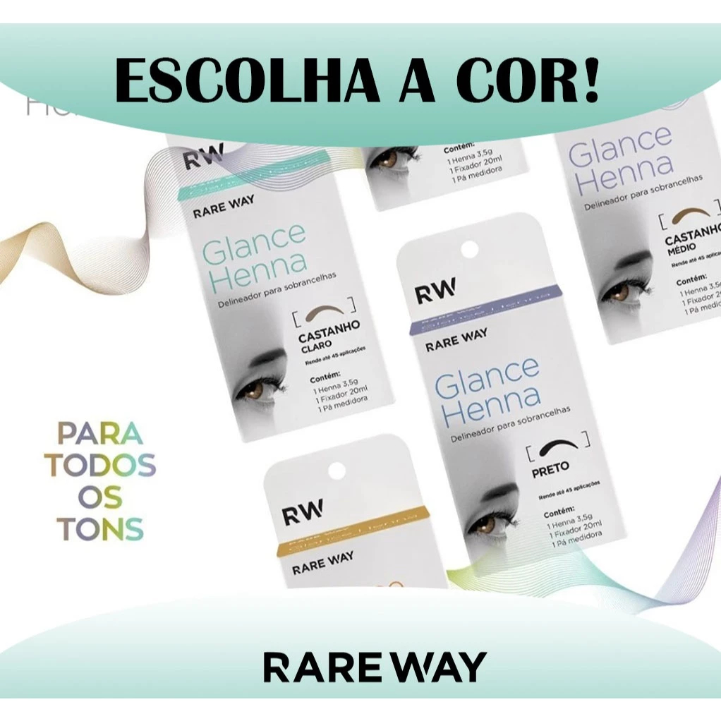 8 opções de cores disponíveis: - LOIRO ESCURO; - CASTANHO CLARO; - CASTANHO MEDIO; - CASTANHO ESCURO; - PRETO; - ULTRA BLACK; - RUIVO; - LOIRO CLARO. CASTANHO CLARO: Ideal para pele clara e cabelos castanhos. CASTANHO MEDIO: Ideal para pele parda e cabelos castanhos. CASTANHO ESCURO: Ideal para pele morena e cabelos escuros. LOIRO ESCURO: Ideal para pele clara e cabelos loiros ou tons chocolate. PRETO: Ideal para pele negra e cabelos pretos. Temos para pronta entrega. Transforme olhares com a Glance Henna, importada da Índia, fácil de aplicar, com excelente durabilidade e fixação. Ela camufla imperfeições e falhas, realçando sobrancelhas naturalmente. Uma cor exclusiva Rare Way. É bom você saber: - 100% Vegano e Cruelty Free: Beleza consciente e ética. - Alto Rendimento: Até 60 aplicações por frasco (3,5g). - Batoque e espátula inclusos: Aplicação prática e precisa. - Melhor Custo-Benefício: 17% a mais de henna por caixa. Benefícios Exclusivos: Pigmentação Poderosa e resultados intensos e duradouros; Versatilidade: - Use sozinha ou crie misturas para tons personalizados; - Não contém chumbo; - Não contém amônia; - Não contém peróxido de hidrogênio (água oxigenada); - Não contém iodo; - Livres de metais pesados; - Alto rendimento: Até 60 aplicações; - Fácil aplicação; - Batoque incluso no frasco; - Alta fixação; - Longa duração; - Não testado em animais (Cruelty Free); - Duração de 7 a 15 dias na pele; A combinação de fatores climáticos e ambientais das plantações das quais nossas hennas vêm contribui para a excelência do nosso produto, entregando uma henna de alta pigmentação. Como usar: 1º - Abra o frasco que contém o pó e coloque 1 medida usando a pá medidora. Adicione de 6 a 10 gotas da loção fixadora no anel porta-batoque ou no pote de cristal e misture bem. 2º - Use o palito aplicador para misturar o produto até obter uma textura cremosa e homogênea. Se a mistura ficar muito grossa, adicione mais algumas gotas da loção fixadora. 3º - Aplique o produto com o palito aplicador ou com a ajuda de um pincel chanfrado. 4º - Deixe o produto agir na pele por 15 a 30 minutos. 5º - Remova o produto com algodão umedecido em água. Ingredientes: Extrato da planta Lawsonia inermis (henna). Não contém chumbo, não contém amônia, não contém peróxido de hidrogênio (água oxigenada), não contém iodo; E livre de metais pesados. Contém na embalagem: 01 Glance Henna (Pó) 3,5 g; 01 Fixador Glance Henna 20 ml; 01 Pá medidora.