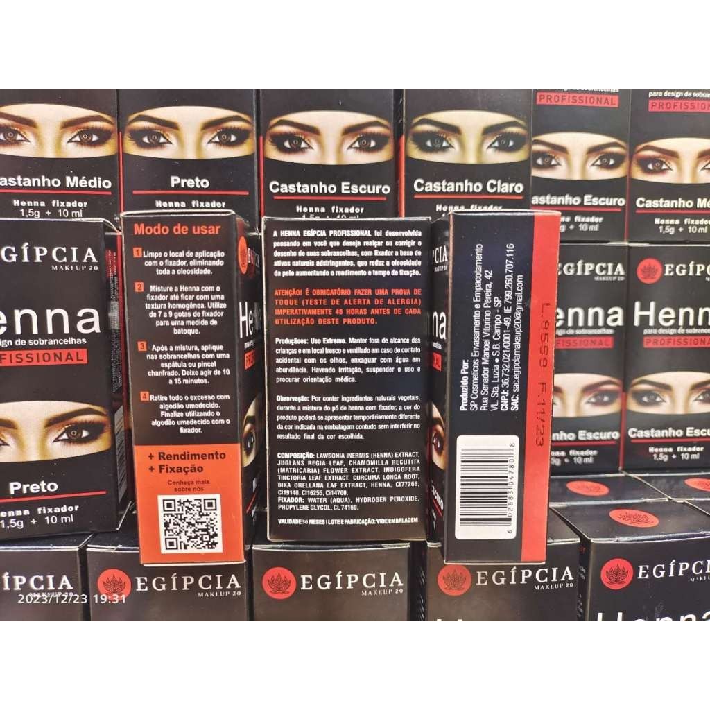 Modo de usar: 1. Modele a sobrancelha, conforme de costume e a seu gosto, retirando o excesso de pelos e aparando os fios mais longos; 2. Limpe o local de aplicação com o fixador, eliminando toda oleosidade; 3. Prepare o produto na proporção de 6 (oito) a 10 (dez) gotas de fixador para uma medida de batoque (lacre) da henna. Misturar até obter uma massa homogênea; 4. Aplique a henna sobre a sobrancelha com um palito de plástico ponta fina ou com pincel chanfrado; 5. Deixe agir por 20 minutos; 6. Retire todo o excesso com algodão umedecido em água mineral; 7. Em caso de pele oleosa, faça outra aplicação seguindo os mesmos procedimentos.