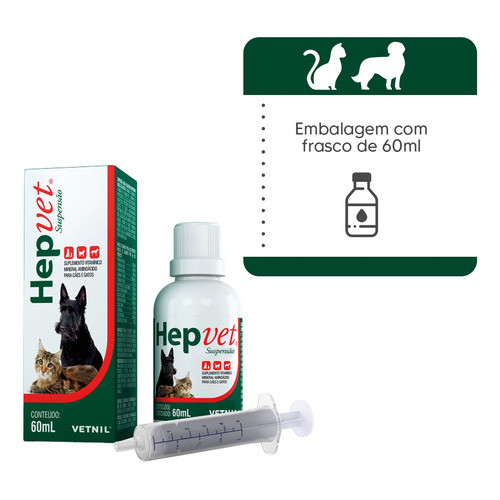 Somos revendedores Autorizados do Laboratório. Produto Original, Lacrado, Com nota fiscal e validade longa. O Hepvet Suspensão 60ml, produzido pela Vetnil, é um medicamento veterinário desenvolvido para auxiliar no suporte e na proteção da saúde hepática de cães e gatos. O fígado desempenha um papel fundamental no organismo dos animais, e o Hepvet é formulado para promover o funcionamento adequado deste órgão vital. Aqui está uma descrição detalhada do Hepvet Suspensão: Indicação : O Hepvet Suspensão é indicado para cães e gatos que apresentam distúrbios hepáticos, como hepatite, esteatose hepática (acúmulo de gordura no fígado), cirrose e outros problemas relacionados ao fígado. Mecanismo de Ação : O medicamento contém princípios ativos que auxiliam na regeneração e proteção das células hepáticas, além de facilitar a digestão de gorduras e a absorção de nutrientes. Isso ajuda o fígado a funcionar de maneira mais eficiente. Composição : A fórmula do Hepvet pode variar, mas muitas vezes inclui substâncias como a silimarina e a metionina, que são conhecidas por seus benefícios ao fígado. Administração : O Hepvet é geralmente fornecido na forma de uma suspensão líquida, o que facilita a administração oral. O veterinário determinará a dosagem adequada com base no peso e na condição do animal. Eficácia : A eficácia do Hepvet pode variar de animal para animal e depende da gravidade da condição hepática. O uso adequado e regular sob supervisão veterinária é fundamental para obter os melhores resultados. Acompanhamento Veterinário : O uso do Hepvet deve ser orientado e monitorado por um veterinário. O profissional avaliará a necessidade do tratamento, fará exames para diagnosticar a condição hepática e ajustará a dosagem conforme necessário.