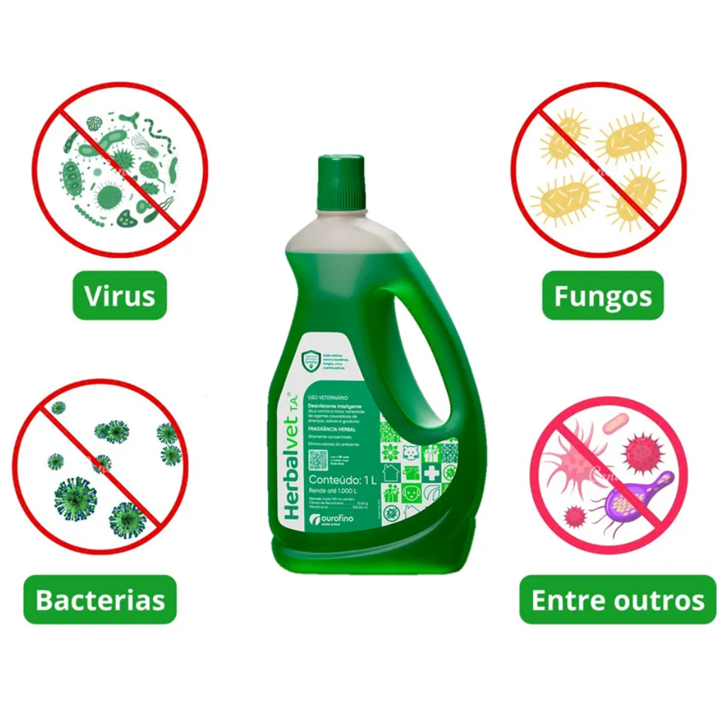 Desinfetante Bactericida Herbalvet Ourofino 1L - Desinfecção de ambientes; - Possui ação anti bactericida, fungicida e viricida; - Embalagem do dosador; - Altamente concentrado. A higiene do ambiente onde seu pet fica é importante e precisa estar sempre em dia. Herbalvet possui ação bactericida, fungicida e viricida, não é corrosivo, não mancha tecidos e é altamente seguro. Herbalvet Ourofino é indicado como desinfetante bactericida, fungicida, viricida e desodorizante com propriedade tensoativa biodegradável e não corrosiva. O poder tensoativo de Herbalvet T.A. rompe a camada invisível de mucopolissacarídeos, lipídeos e proteínas (Biofilme), que protegem a colônia microbiana, dificultando a ação dos desinfetantes. Desinfetante Herbalvet é indicado para desinfecção e desodorização de ambientes em geral, clínicas veterinárias, hospitais veterinários, canis, gatis, na limpeza e desinfecção do piso, paredes, salas de banho e tosa, mesas de atendimento e de cirurgia e instrumentais cirúrgicos. Modo de usar o Herbalvet Para uma correta desinfecção, é recomendada a remoção mecânica de toda a sujeira, seguida de lavagem com água e sabão. Em seguida enxaguar para retirar todo o resíduo de sabão e deixar secar. Somente depois de limpo e seco é que se recomenda a aplicação do desinfetante. Herbalvet deve ser diluído na água, na dosagem de 1 mL do produto para 500 mL de água, ou seja, 10 mL em 5 litros de água e aplicado ou pulverizado nos pisos, paredes, mesas, canis e gatis.