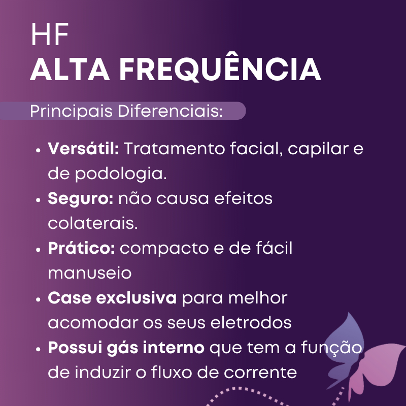 HF - Alta Frequência Ibramed KIT com 09 ELETRODOS + RACK Organizador Registro na Anvisa: 10360310020 Atenção: eletrodos enviados com espuma de proteção. Verifique antes de descartar as embalagens. O HF Ibramed é um equipamento de Alta Frequência portátil, de fácil aplicação, utilizado em tratamentos faciais, capilares e de podologia. Trata-se de técnicas sem efeitos sistêmicos, que não causam dependência nem efeitos colaterais indesejáveis. Nas aplicações de alta frequência utilizam-se eletrodos de vidro, onde dentro existe um gás especial que é o meio condutor do estímulo elétrico. O equipamento gera uma tensão alternada de alguns milhares de volts (baixa corrente) que é aplicada a este eletrodo de vidro. O gás dentro do vidro será então excitado produzindo pequenas faíscas elétricas na face externa do eletrodo de vidro. Durante este processo de faíscas elétricas é gerado ozônio, e são as propriedades do ozônio, tais como, oxigenante, fungicida, bactericida que são aproveitadas neste tipo de tratamento. Para a aplicação, é utilizada uma caneta que chamamos caneta HF, onde são conectados os eletrodos de vidro. Indicações: - Tratamentos para desinfecção da pele acneica - Lesões podais - Cauterização da pele pós-extração de pústulas - Facilitação na permeação de ativos - Utilizado em protocolos de revitalização e hidratação da pele - Desinfecção do couro cabeludo no caso de seborreias - Estimulação da circulação sanguínea facial e capilar - Pós-depilação - Em solução de continuidade da pele (úlceras de pressão e feridas abertas) - Feridas inflamadas pós-extração de cutículas ungueais Efeitos Fisiológicos: - Ação bactericida - Ação fungicida e germicida - Ação antisséptica - Aumento da oxigenação e nutrição celular - Vasodilatação e hiperemia - Ativação da circulação periferica local - Na cicatrização, atua acelerando a ação do fibroblastos na produção de colágeno - Melhora do trofismo dérmico Técnicas de Aplicação: - Fluxação: com passagem lenta e por igual dos eletrodos geralmente com superfície plana, em contato direto sobre a pele. Com efeito descongestivo e calmante, diminuindo a hiperemia; - Faiscamento direto: com o eletrodo um pouco afastado da pele provocando faíscas, nesse método de aplicação ocorre a formação de ozônio; - Faiscamento indireto: o cliente segura o eletrodo saturador em uma das mãos e a bobina na outra. Essa técnica permite a permeação de ativos hidratantes e emolientes que não contenham substancias inflamável. Cuidados Especiais: - Os eletrodos são muito sensíveis e podem quebrar em caso de mau uso e descuido no transporte e manuseio. - O uso de acessórios considerados incompatíveis com o equipamento pode causar danos ao mesmo. Dados Técnicos: HF – Alta Frequência Ibramed Alimentação: Bivolt Seletor (selecione a voltagem desejada antes de conecta-lo a rede elétrica) Registro Anvisa: 10360310020 Garantia: 18 meses Medidas e pesos aproximados: Dimensões: 7x11x6cm (L x P x A) Peso: 1Kg Itens Inclusos: 01 Equipamento de Alta Frequência HF 01 Acesso ao Manual de Operação Digital 01 Bolsa para transporte 01 Eletrodo de Vidro para Alta Frequência Pente 01 Eletrodo aplicador de vidro tipo Esférico maior * 01 Eletrodo de vidro para Alta Frequência Cebolão pequeno 01 Eletrodo de vidro para Alta Frequência Cauterizador 01 Eletrodo de Vidro para Alta Frequência Saturador 01 Eletrodo de Vidro para Alta Frequência Cauterizador 01 Eletrodo de Vidro para Alta Frequência Cebolinha 01 Eletrodo de Vidro para Alta Frequência Cebolão 01 Eletrodo de Vidro para Alta Frequência Forquilha 01 Rack Acrílico Organizador de Eletrodos DÚVIDAS? FAÇA SUA PERGUNTA ABAIXO! SERÁ UM PRAZER LHE ATENDER!