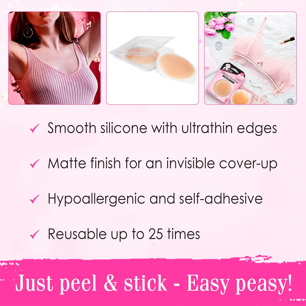 HF Secrets Silicone CoverUps - Capas de Mamilo Invisíveis, Hipoalergênicas, Reutilizáveis e Confortáveis, Tom Pele Médio 1. Alternativa Superior ao Sutiã: Experimente a liberdade com as HF Secrets Silicone CoverUps. Projetadas com borda afunilada, estas capas autoadesivas para mamilos garantem um visual ultra-suave sob qualquer tipo de top. Sua composição hipoalergênica e delicada com a pele oferece conforto sem igual para o uso diário. 2. Conforto Imperceptível: Graças às bordas ultrafinas, essas capas se integram perfeitamente à sua pele, assegurando que você se sinta como se não estivesse usando nada. O acabamento fosco previne qualquer brilho indesejado, mantendo sua aparência natural e discreta. 3. Adesivo Seguro e Delicado: Com uma fórmula aprovada por dermatologistas, a camada adesiva de silicone destas capas adere com firmeza, sem causar irritação à pele sensível. Elas são a escolha ideal para uso contínuo, permitindo que você se mova com confiança. 4. Discrição Garantida: As CoverUps em tom de pele médio são virtualmente invisíveis sob as roupas, tornando-as perfeitas para serem usadas com tops transparentes e tecidos finos. Aproveite um acabamento polido e profissional, sem preocupações. 5. Durabilidade e Reusabilidade: Estes protetores de mamilos são incrivelmente duráveis, podendo ser utilizados até 25 vezes com o cuidado adequado. Eles se mantêm no lugar durante exercícios, natação e outras atividades intensas, oferecendo uma alternativa confortável e prática aos sutiãs tradicionais. Garantia 90 dias