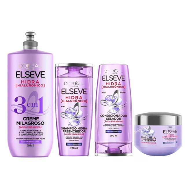 ESSE KIT CONTÉM: 1 CREME MILAGROSO ELSEVE 3 EM 1 HIDRA HIALURÔNICO HIDRATANTE 500ML 1 SHAMPOO PREENCHEDOR ELSEVE HIDRA HIALURÔNICO LORÉAL PARIS 200ML 1 CONDICIONADOR SELADOR ELSEVE HIDRA HIALURÔNICO LORÉAL PARIS 200ML 1 MÁSCARA INTENSIVA ELSEVE HIDRA HIALURÔNICO LORÉAL PARIS 300G A linha Elseve Hidra Hialurônico preenche e retém hidratação profunda na fibra capilar para uma transformação instantânea dos fios. O Creme Milagroso 3 em 1 é seu aliado para combater a desidratação dos cabelos deixando os livres e saudáveis. Nosso Creme Milagroso 3 em 1 é o seu aliado diário para você utilizar da maneira que deseja: para uma definição dos sonhos como creme de pentear, transformação dos sonhos como um tratamento intensivo e desembaraço dos sonhos como um super-condicionador. Especialmente desenvolvido com o poder do ácido hialurônico, o 3 em 1 proporciona 4x mais hidratação para os cabelos da raiz até as pontas, sem pesar. Como Usar Condicionador: Aplique em todo o comprimento, até as pontas. Deixe o produto agir por 3 minutos e enxague abundantemente. Tratamento Intensivo: Aplique em todo o comprimento, até as pontas. Deixe o produto agir por 5 ou mais minutos e enxague abundantemente. Creme de Pentear: Aplique sobre o cabelo úmido ou seco. Não enxague. Penteie como de costume. O Shampoo Hidra Preenchedor, especialmente desenvolvido com agentes condicionantes inteligentes, é capaz de promover ao mesmo tempo uma limpeza profunda e hidratação da raiz às pontas com resultados no primeiro uso. Nossa fórmula exclusiva, enriquecida com Ácido Hialurônico, preenche e retém hidratação profunda na fibra capilar para uma transformação instantânea dos fios. O Condicionador Selador desembaraça os fios instantaneamente, controla o frizz e sela as cutículas para cabelos hidratados, soltos e cheios de movimento. Nossa fórmula exclusiva, enriquecida com Ácido Hialurônico, preenche e retém hidratação profunda na fibra capilar para uma transformação instantânea dos fios . Cabelos leves, soltos e saudáveis. Nosso Creme de Tratamento Elseve Hidra Hialurônico deixa seu cabelo hidratado por muito mais tempo. Com Ação Preenchedora, controla os frizz, desembaraça os fios, deixando os cabelos saudáveis leves e soltos no primeiro uso. Modo de uso: Aplique o Shampoo nos cabelos molhados, massageie suavemente e enxágue. Repita a operação se necessário. Em seguida Aplique o condicionador em todo o comprimento, até as pontas. Deixe o produto agir e enxágue abundantemente. Depois Aplique o creme de tratamento nos fios lavados e úmidos. Deixe agir por 5 minutos. Enxágue bem. Indicado para todos os tipos de cabelos, que necessitam de hidratação profunda e controle de frizz.