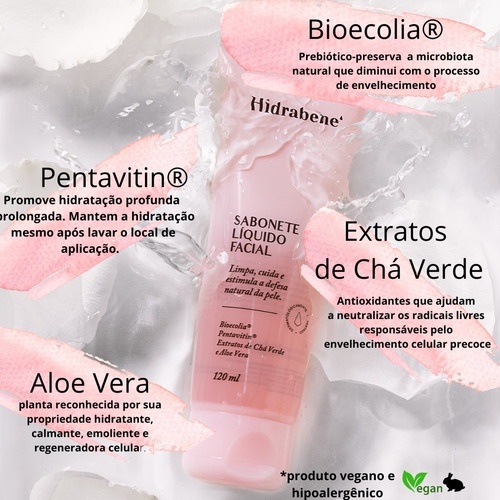 Sabonete Líquido Facial Hidrabene Hidratante Aloe Vera 120ml - Vegano Uma rotina eficiente de cuidados faciais começa com uma boa limpeza. Indicado para todos os tipos de pele, Hidrabene Sabonete Líquido Facial foi desenvolvido para cuidar da pele delicada do rosto, pois remove as impurezas de forma suave e eficaz. Formulado com uma rica combinação de ativos que promovem hidratação prolongada e profunda, melhoram o aspecto cutâneo e estimulam a proteção natural da microbiota da pele. Produto dermatologicamente testado, hipoalergênico, formulado de maneira a minimizar possível surgimento de alergia. Benefícios: • Remove as impurezas de forma suave e eficaz. • Não resseca a pele. • Promove hidratação profunda e prolongada. • Melhora o aspecto cutâneo. • Estimula a proteção natural da microbiota da pele. • Para todo tipo de pele. • Produto hipoalergênico e dermatologicamente testado. Modo de Usar: Use diariamente de manhã e à noite. Aplique uma pequena quantidade do produto nas mãos e espalhe sobre o rosto molhado massageando suavemente. Após, enxágue com água e continue a sua rotina diária de cuidados faciais. Precauções: Uso externo. Uso adulto. Mantenha fora do alcance das crianças, em local fresco. Se houver contato acidental com os olhos, enxágue com água. Em caso de ingestão acidental do produto, procure um médico. Não utilize se for sensível a algum componente da fórmula. Suspenda o uso em caso de irritação na pele. Composição: Aqua, Sodium Methyl 2-Sulfolaurate, Sodium Lauryl Sulfoacetate, Lauramidopropyl Betaine, Alpha-Glucan Oligosaccharide, Sodium Chloride, Disodium 2-Sulfolaurate, Cetyl Betaine, Saccharide Isomerate, Camellia sinensis Leaf Extract, Aloe barbadensis Leaf Extract, Phenoxyethanol, Lauryl Betaine, Parfum, Myristyl Betaine, Disodium EDTA, Methylisothiazolinone, CI 16185, Sodium Sulfate. Ativos: Bioecolia, Pentavitin Extratos de Chá Verde e Aloe Vera. Registro ANVISA: 25351.228246/2019-11