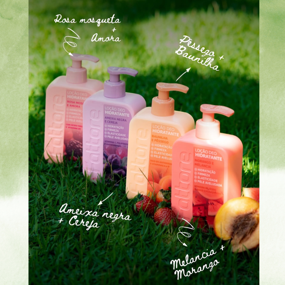 Loção Hidratante Corporal Fattore 400ml – Nutrição, Proteção e Perfume Duradouro Descrição: A Loção Hidratante Fattore foi desenvolvida para proporcionar cuidado intenso e diário à pele. Com fórmula leve e de absorção imediata, hidrata profundamente sem deixar sensação oleosa, deixando a pele aveludada, macia e com fragrância sofisticada. Além disso, auxilia na prevenção do ressecamento e no cuidado contra os sinais do tempo. Opções de fragrâncias e ativos: 🍇 Rosa Mosqueta & Amora – Enriquecida com Ácido Hialurônico + Vitamina B5 → Hidrata, suaviza e auxilia na regeneração da pele. 🍒 Ameixa Negra & Cereja – Com Vitamina C + Antocianinas → Ajuda a firmar, revitalizar e prevenir o envelhecimento precoce. 🍓 Morango & Melancia – Contém Vitamina B6 + Flavonoides → Promove elasticidade, frescor e efeito antioxidante. 🍑 Baunilha & Pêssego – Com Vitaminas A e E → Nutre profundamente e oferece uma fragrância doce e aconchegante. Principais benefícios: ✔ Hidratação prolongada com toque seco ✔ Fórmula leve e de rápida absorção ✔ Perfume intenso e envolvente ✔ Ação antioxidante que protege a pele ✔ Indicado para todos os tipos de pele ✔ Ideal para uso diário, especialmente após o banho Modo de uso: Aplicar sobre a pele limpa e seca, espalhando com movimentos suaves até completa absorção. Manter a pele hidratada todos os dias é fundamental para preservar a saúde, elasticidade e luminosidade natural, garantindo maciez e aparência jovem por mais tempo.