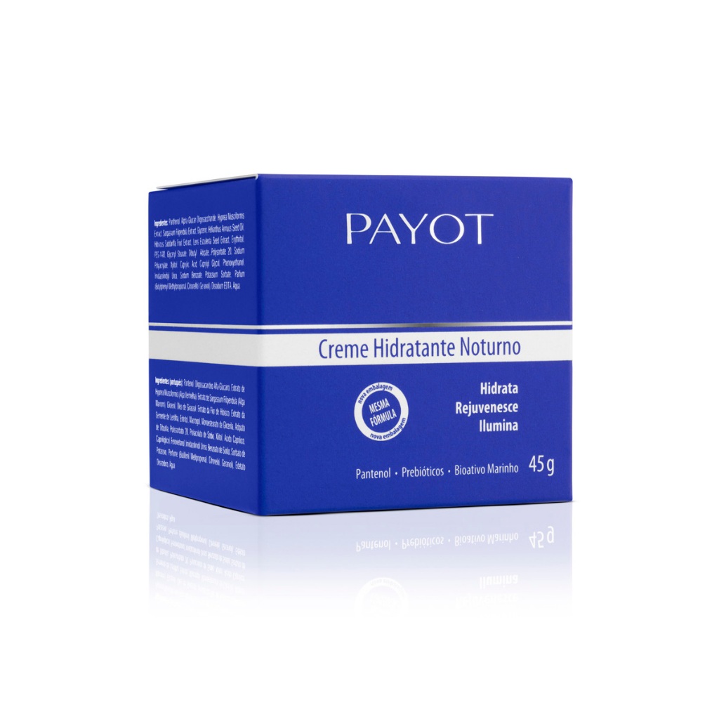 Creme Hidratante Noturno Payot promove hidratação profunda e prolongada. Sua fórmula combina ingredientes como Pantenol, que possui poderosa ação hidratante, Prebióticos, que preservam e regulam a umidade da pele e Bioativo Marinho, ingrediente obtido através de algas que auxilia no rejuvenescimento, reduzindo rugas e linhas de expressão, além de minimizar o tamanho dos poros. A combinação destes potentes ingredientes age na estimulação da circulação, devolvendo à pele a luminosidade natural, a suavidade e maciez. Rápida absorção. testes clínicos comprovam: • 87% pele mais hidratada • 80% pele macia e rejuvenescida • 80% de aumento no viço e luminosidade • 80% de melhora na aparência e qualidade geral da pele Não testado em animais Vegano Dermatologicamente testado Hipoalergênico ATENÇÃO: Validade JULHO/26*