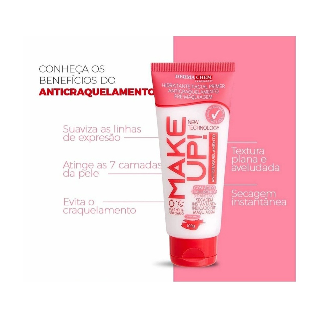 HIDRATANTE FACIAL PRIMER ANTI CRAQUELAMENTO MAKE UP - DERMACHEM O Hidratante Facial Primer Anticraquelamento Pré-Maquiagem Make Up Dermachem Laboratory, possui hidratação elástica D-Pantenol e ácido hialurônico, que atinge até sete camadas da pele, amenizando pequenas imperfeições, linhas de expressões, garantindo uma textura plana, aveludada e elástica na preparação da pele para uma aplicação uniforme de maquiagem, evitando o craquelamento. Seja bem vinda ao mundo tecnológico Make Up Anticraquelamento da Dermachem Laboratory. Modo de usar: aplique no rosto ou corpo com movimentos circulares, aguarde alguns segundos para secar e na sequência, aplique a maquiagem. O hidratante primer make up anticraquelamento também funciona como um hidratante de uso diário, super potente, podendo ser usado em todo o rosto e corpo, proporcionando uma hidratação na pele, mesmo sem usar maquiagem, atenuando e suavizando as linhas de expressões. Precauções e advertências: em caso de contato com os olhos lavar com água em abundância. Se houver irritação, suspenda o uso. Mantenha o produto fora do alcance de crianças. Não ingerir. Uso externo. Conservação: conservar em temperatura ambiente. Proteger da luz, do calor e da umidade em excesso.
